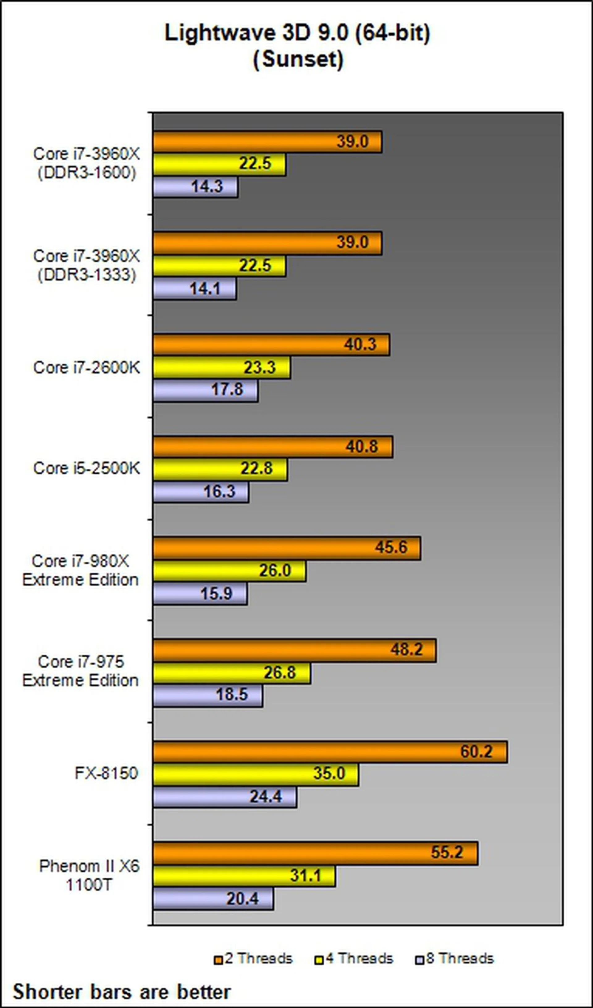 When focusing on the 8-threaded workload setting, we again noted the Core i7-3960X registering nearly a 20% increment over the older hex-core processor. The mainstream Core i5-2500K and i7-2600K both managed to come close to what the second generation Core i7 can achieve, but the latter still held a slight lead (sometimes up to 10%). Using faster memory at 1600MHz hardly mattered in these rendering tasks as the memory bandwidth was clearly not an issue and it's more of the processor's own raw horsepower to crunch through the workloads.