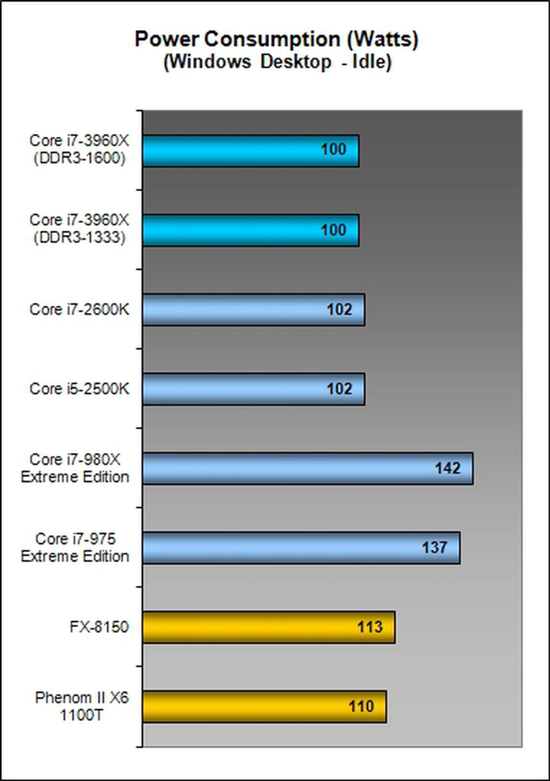 The Sandy Bridge-E processor's idle power consumption is in-line with the existing Sandy Bridge processors, sipping along at about 100W. What's surprising is how efficiently the workstation processor shuts off unnecessary portions of the CPU to achieve an idle power draw equivalent to a mainstream processing platform. Power savings compared to the old hex-core Core i7-980X is about 40%!