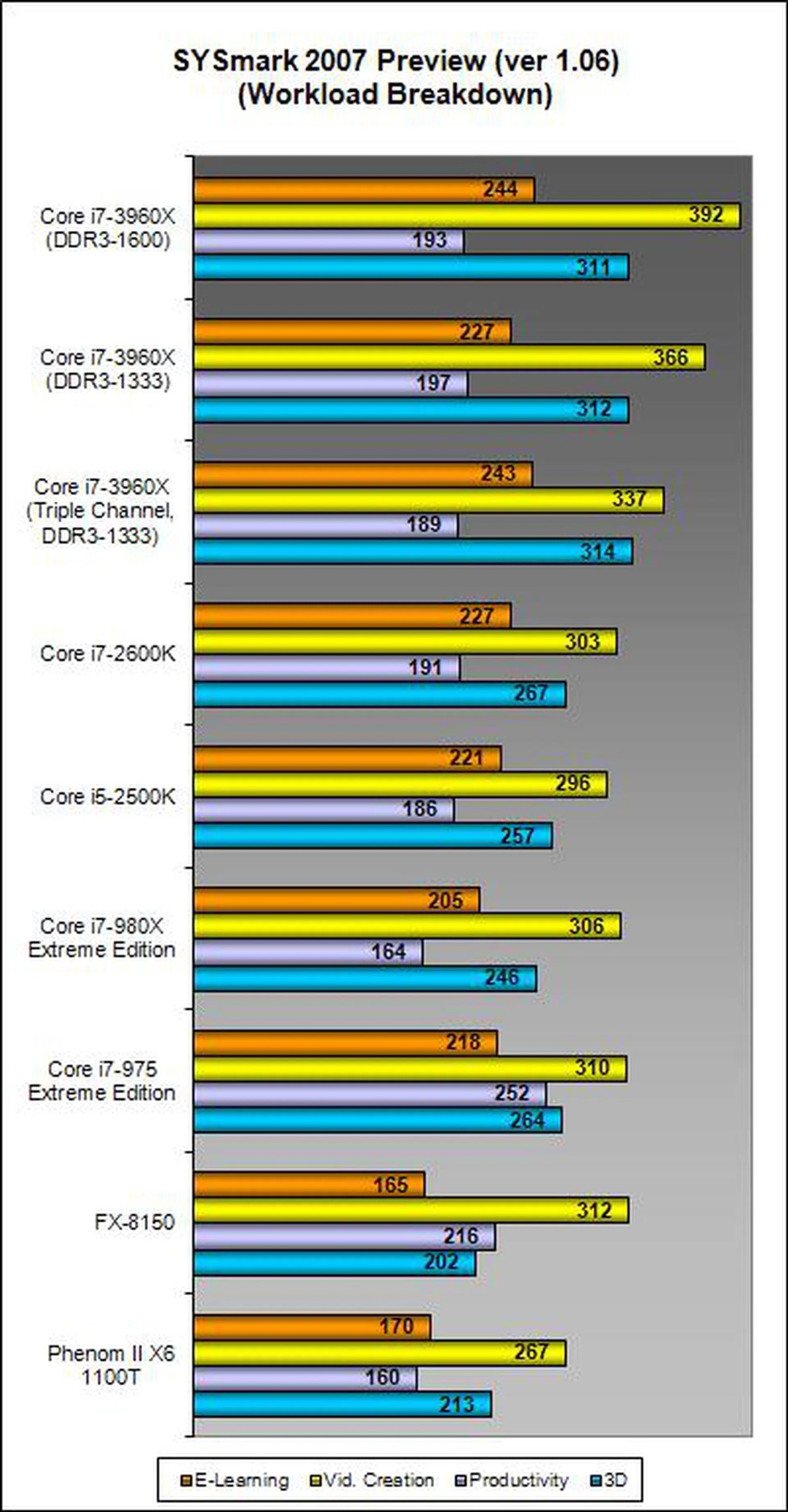 In any case, SYSmark has shown that the new platform using the same memory frequency as the other testbeds is about on par with the existing Sandy Bridge based Intel Core i7-2600k dual-core processor when tested with this benchmarking suite. This should set the expectations straight as not anybody can benefit from a workstation class platform. The results breakdown however shows something notable - the new platform excels in 3D and video content creation tasks. In these tasks, the Core i7-3960X is about 20% to 30% speedier than the Core i7-980X and the Core i7-2600K. So take note content creators!