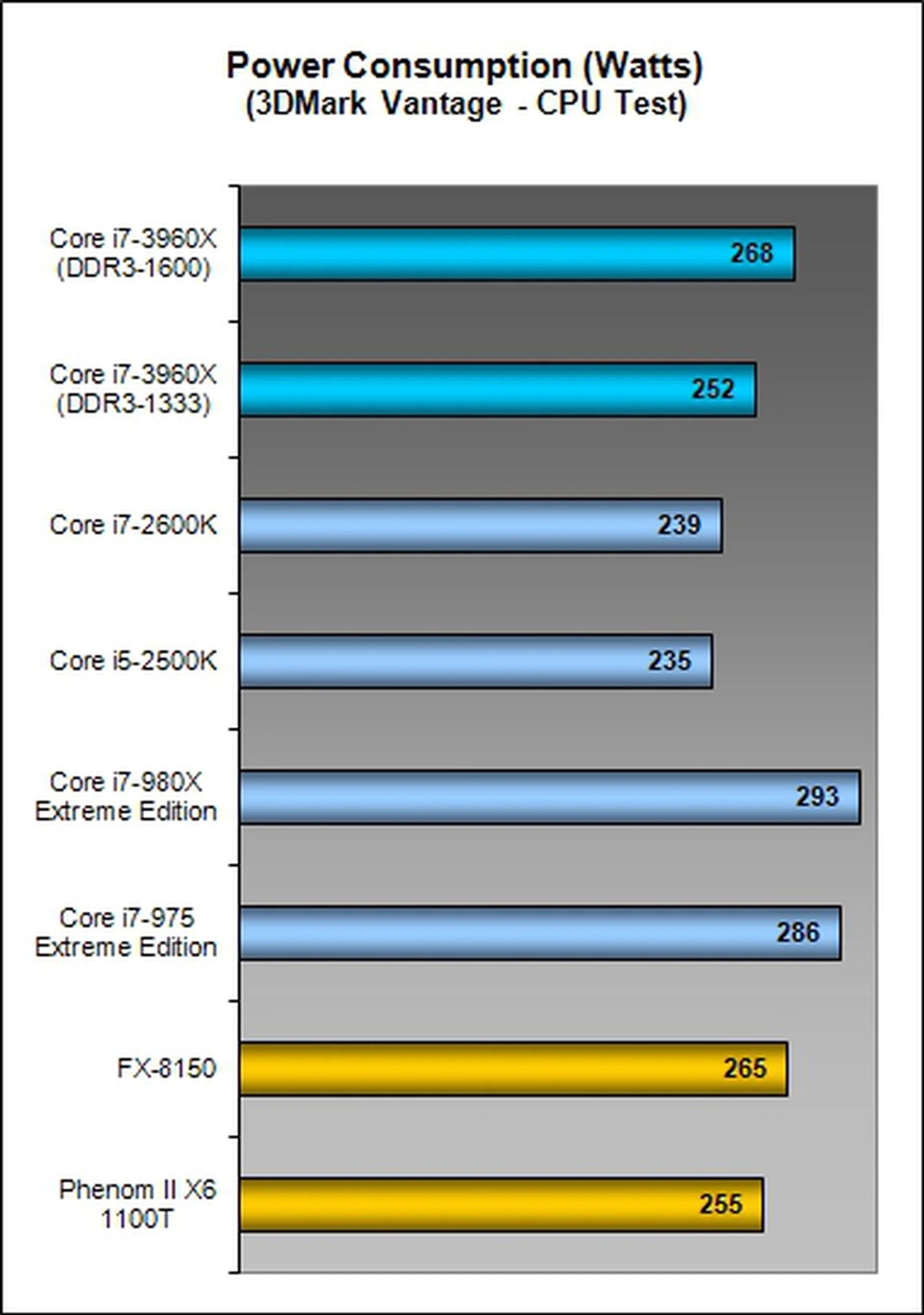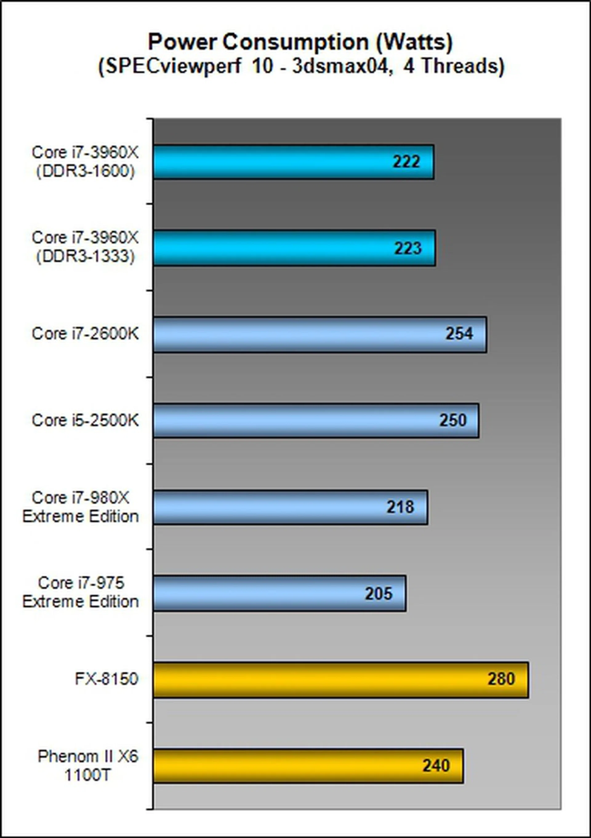 With heavier workloads such as the 3DMark Vantage CPU test, we see the effects of a 130W TDP based processor as compared to the 95W TDP rating of the Sandy Bridge CPUs. Naturally the Sandy Bridge-E processor consumes more power but it was still better than its predecessor and the AMD counterparts. but the 4-thread rendering test of 3dsmax04 seems to show an exception in this situation.