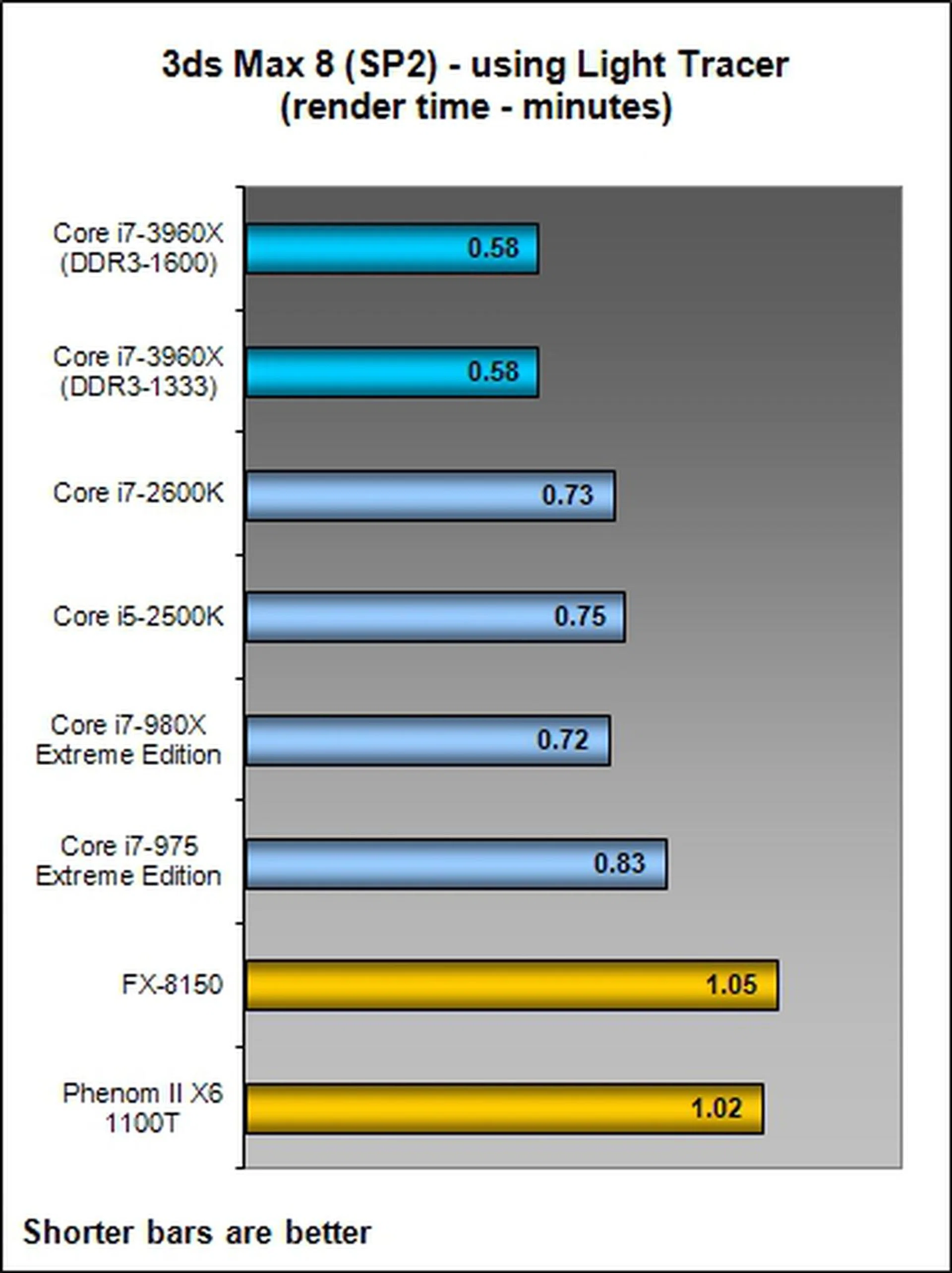 The Intel Core i7-3960X processor continues to prove its mete against the AMD FX-8150 as the former was almost twice as fast on these rendering tasks. Compared with the Intel contingent, the Core i7-3960X was leading by almost 30% when using the Light Tracer render for our workload. Surprisingly though, the difference almost was only down to a few percentage points when using the more strenuous Radiosity renderer.