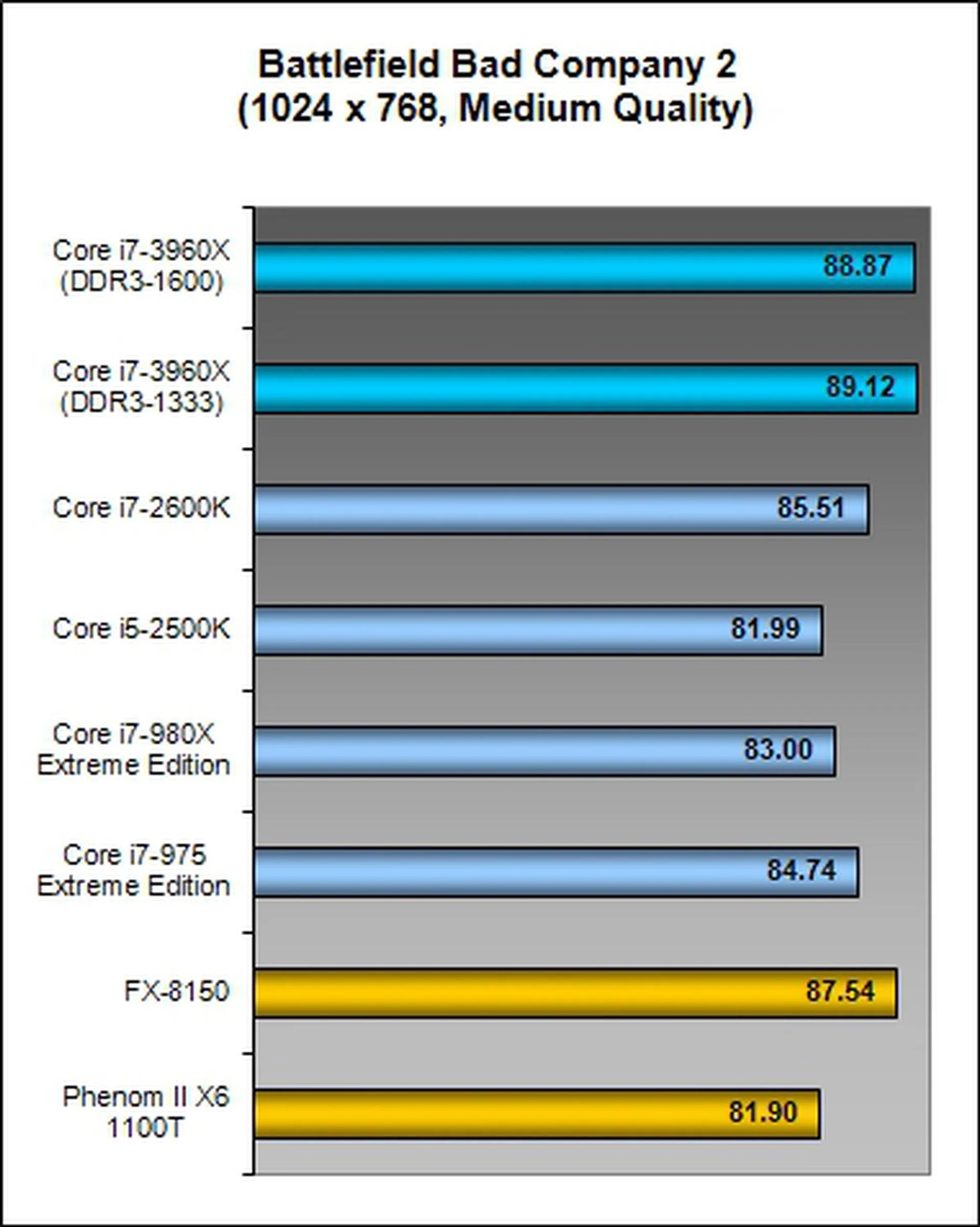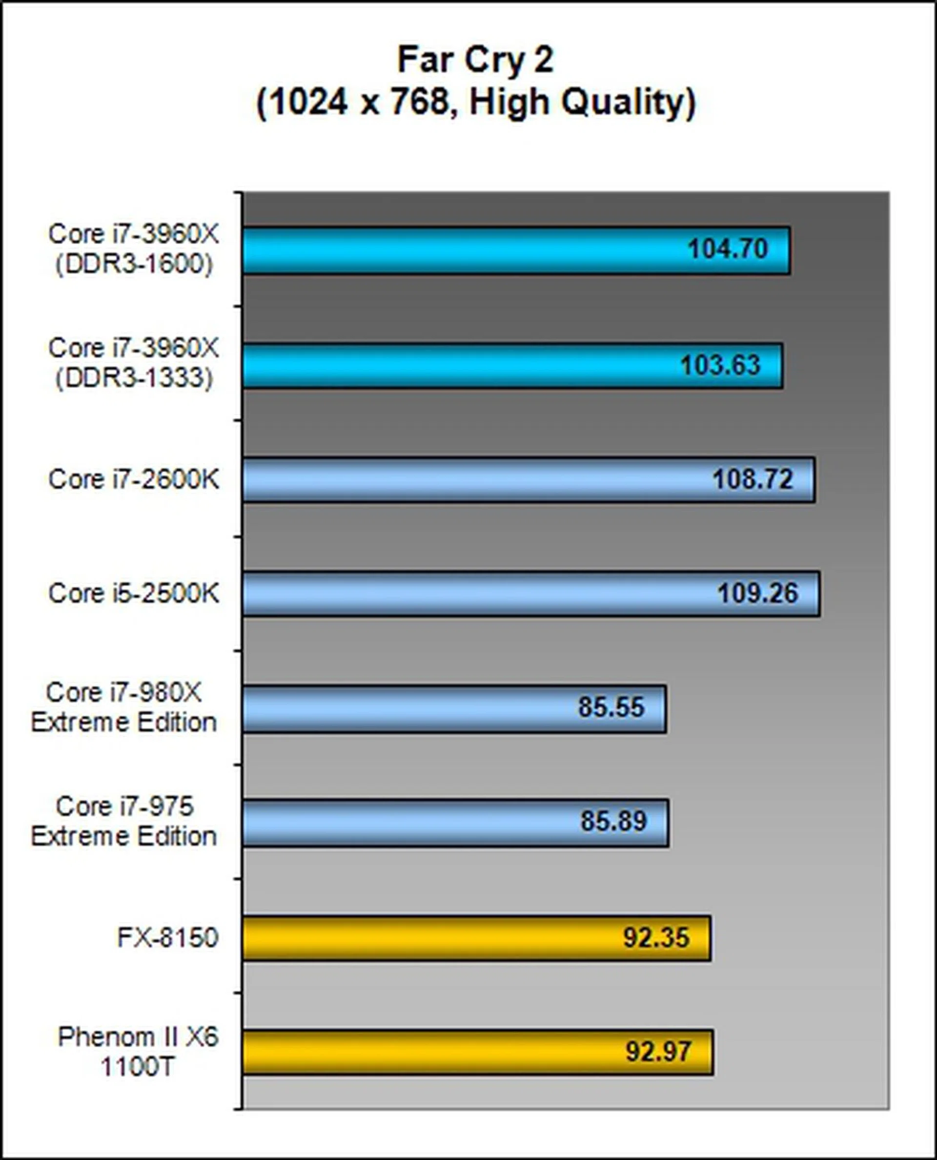 The Sandy Bridge-E CPU came up tops in the Battlefield benchmark, but it was closely trailed by the AMD FX-8150, a surprising comeback from taking the backseat for most of the tests. However,on Far Cry 2, things returned back to normal for the AMD contingent as the Intel Sandy Bridge processors took the lead and was even outperforming the Core i7-3960X by 4.5%.