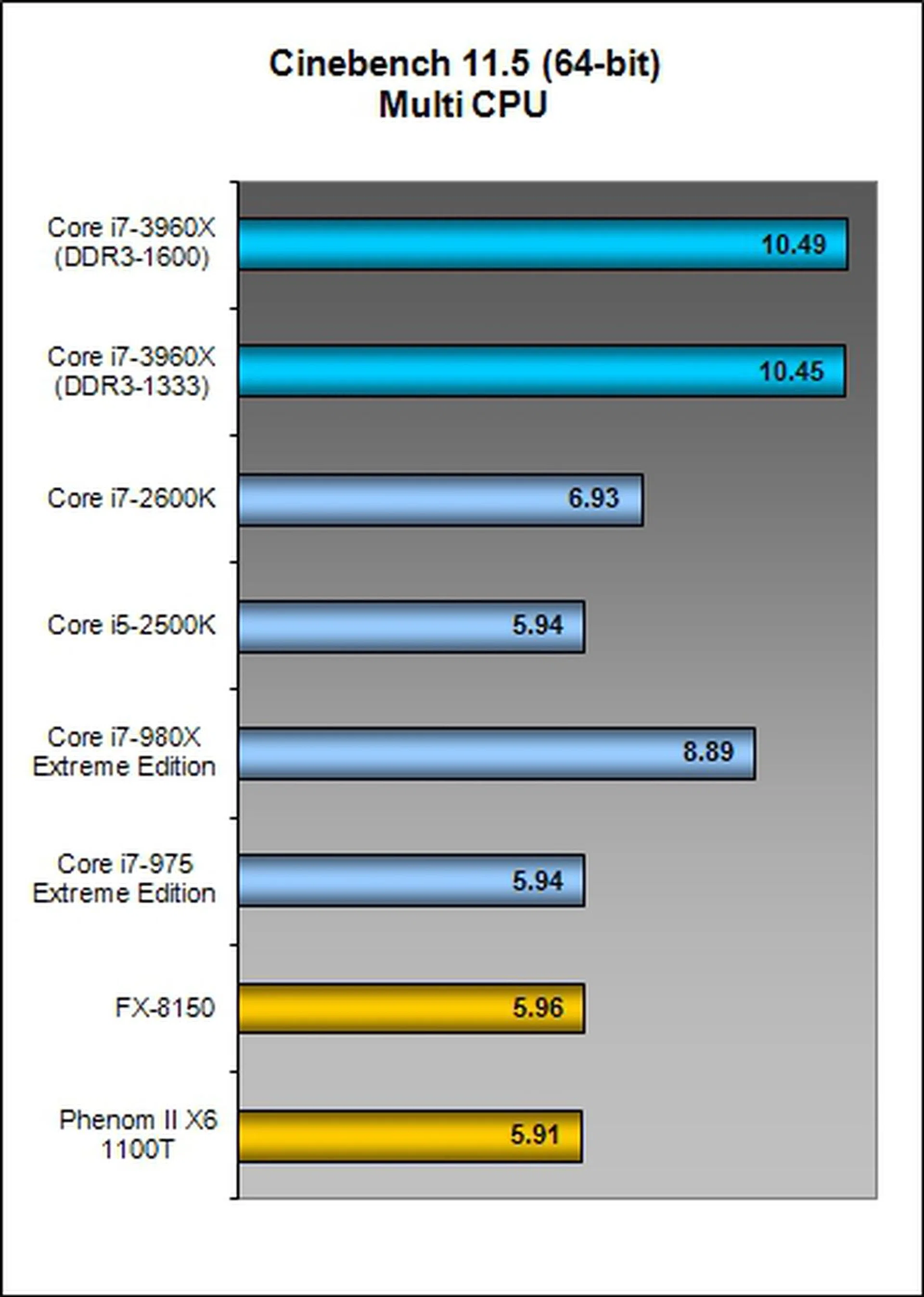 A stellar victory was achieved by the Sandy Bridge-E processor in both the Cinebench rendering program as well video encoding on Handbrake. This can be attributed to both software being well threaded and hence being able to take advantage of the extra processing cores along with HyperThreading technology. For the Cinebench 11.5 test, the Core i7-3960X out-performed the pair of AMD CPUs and the Core i5-2500K by almost approximately 76%! Against the Core i7-2600K and the Core i7-980X, the newcomer was 50% and 24% speedier respectively.