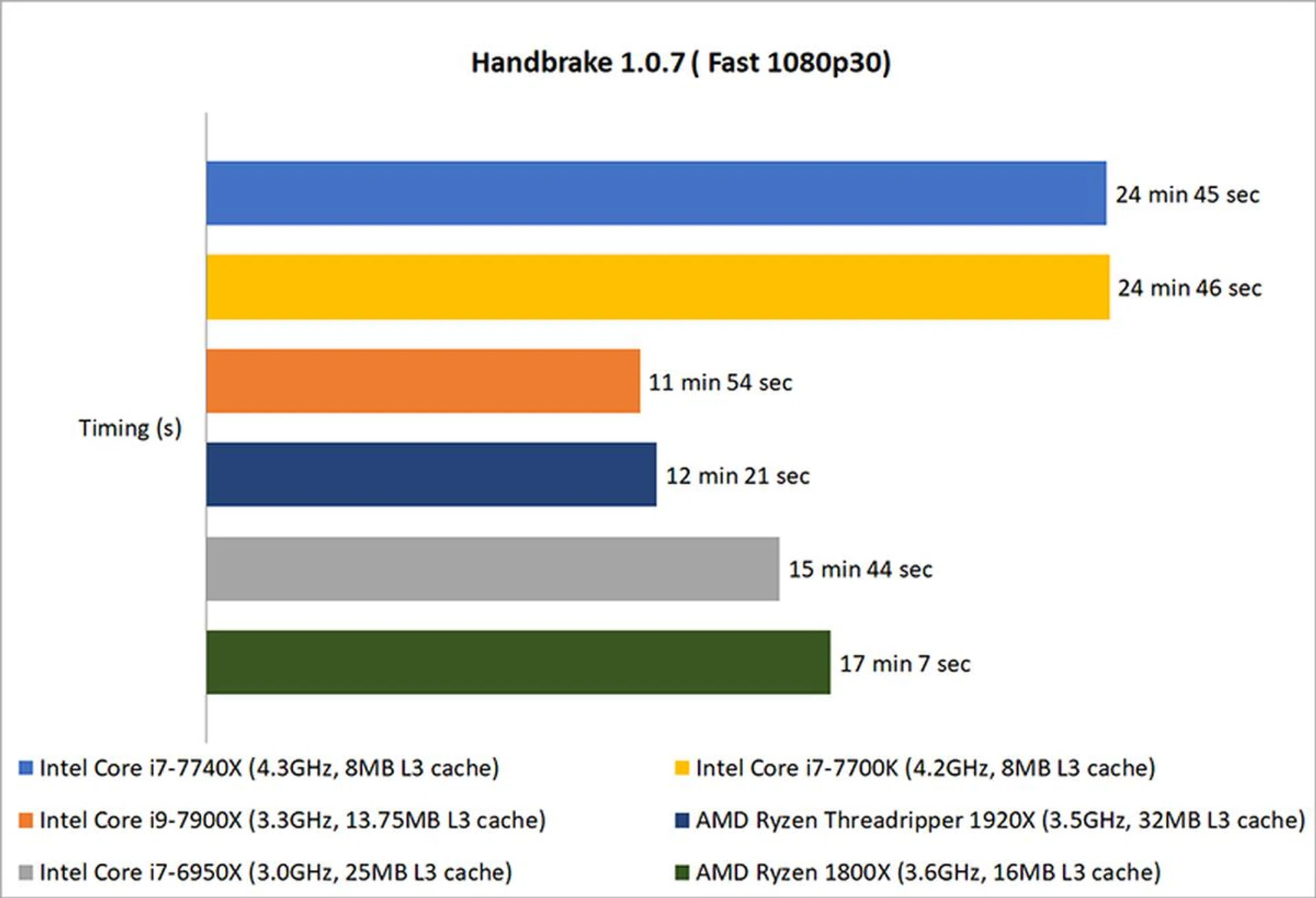 Handbrake is a video transcoder that converts videos into a format for use on PCs and portable electronic devices, and is a good indicator of a processor’s video encoding capabilities. YouTube content creators, Twitch streamers, and other video creators will be most interested in this performance metric.