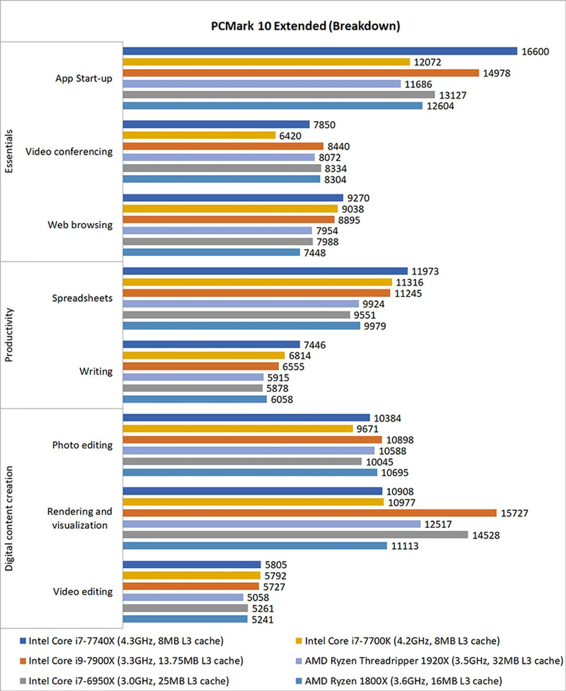 PCMark 10 Extended assesses the performance of systems in a variety of workloads, including basic computing tasks, productivity applications, digital content creation, and gaming. Compared to PCMark 8, it also adds in new test metrics, such as app startup times, which quantifies how long it takes to launch a variety of real-world apps, and a rendering and visualization workload to simulate professional graphics and engineering applications. In addition, existing workloads have been updated to reflect modern usage