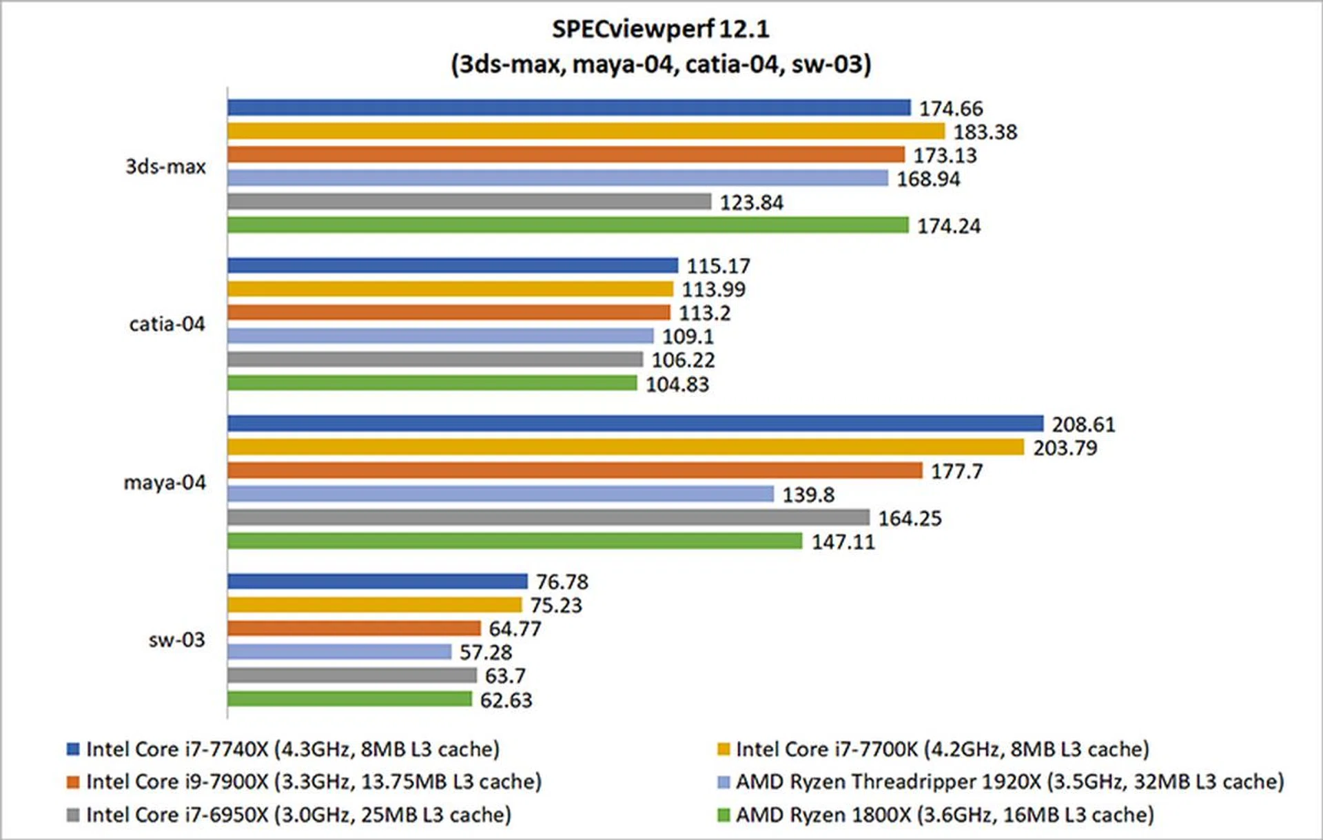 Both the Core i7-7740X and Core i7-7700K were pretty much on par here, although the latter did take a small lead in the 3ds-max viewset. Having said that, SPECviewperf 12.1 clearly doesn’t scale very well with high thread counts, and the two quad-core chips outstripped everything else.