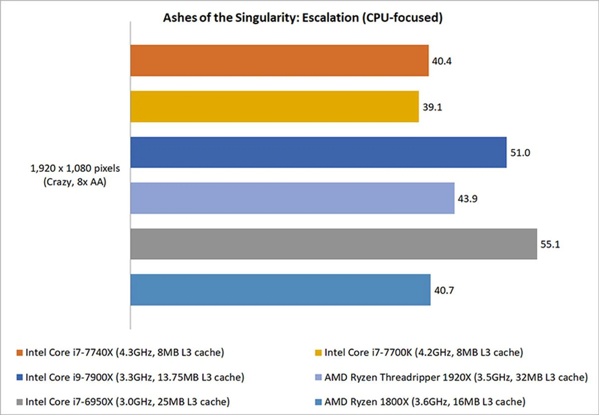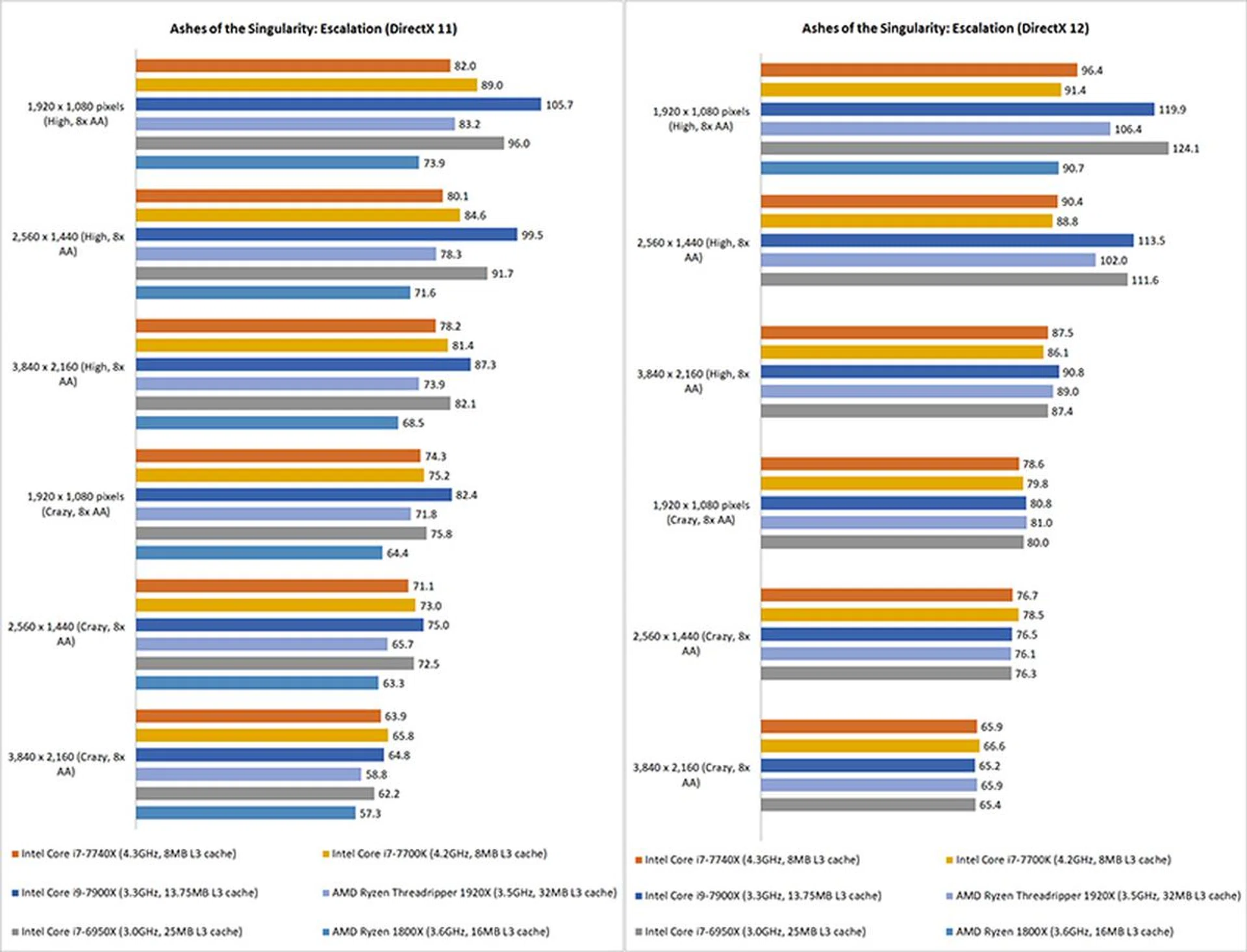Ashes of the Singularity: Escalation was one of the first games to be updated with optimizations for Ryzen, and both Threadripper processors come very close to challenging the Intel Core i9-7900X in DirectX 12 mode at 1080p.