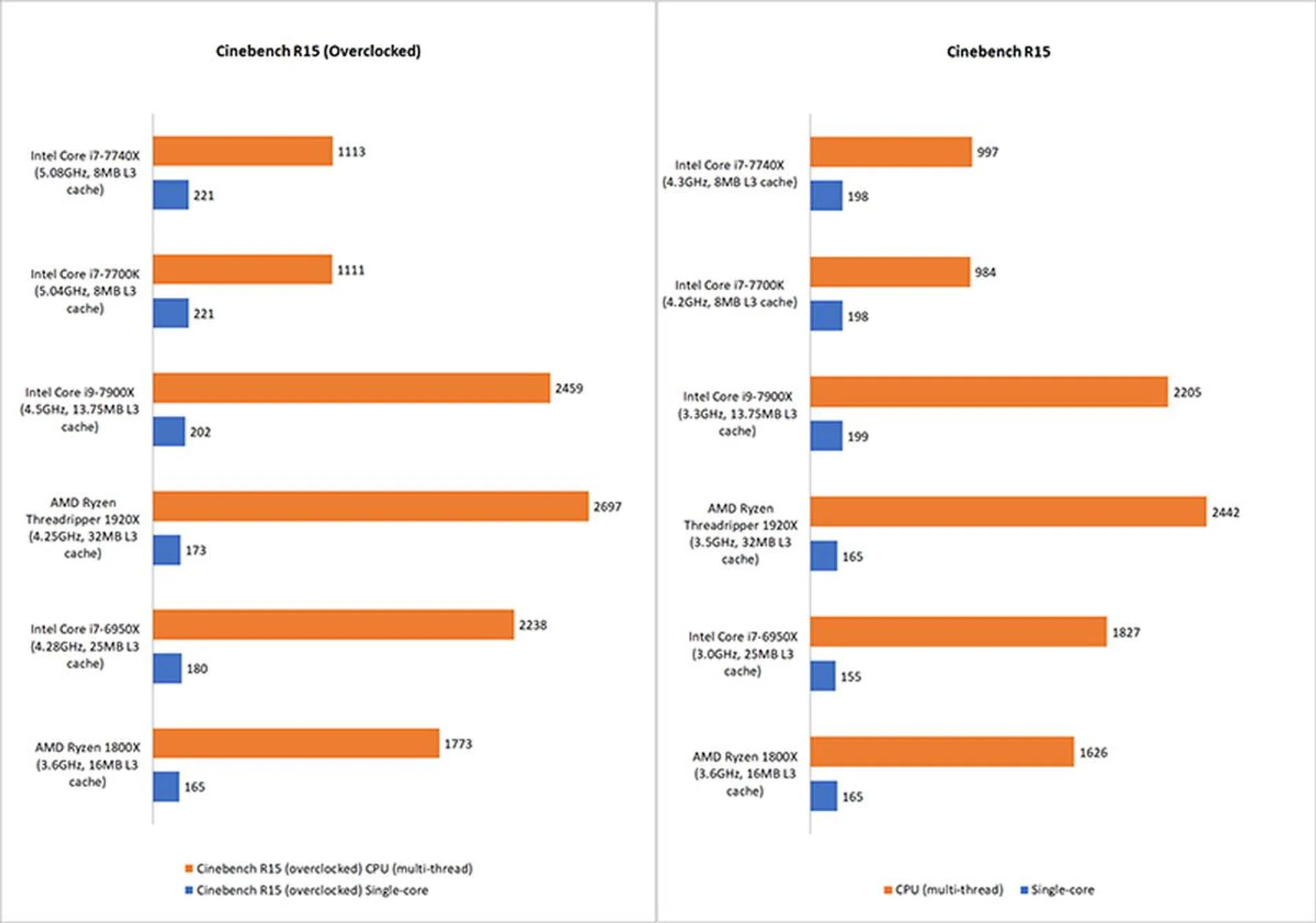 Cinebench R15 is a better indicator of Threadripper and the Core i9’s performance because of its ability to utilize up to 256 threads to evaluate a processor’s performance in a photorealistic 3D rendering. We ran both single-core and multi-core benchmarks to evaluate single-threaded performance and multi-threaded scalability here.