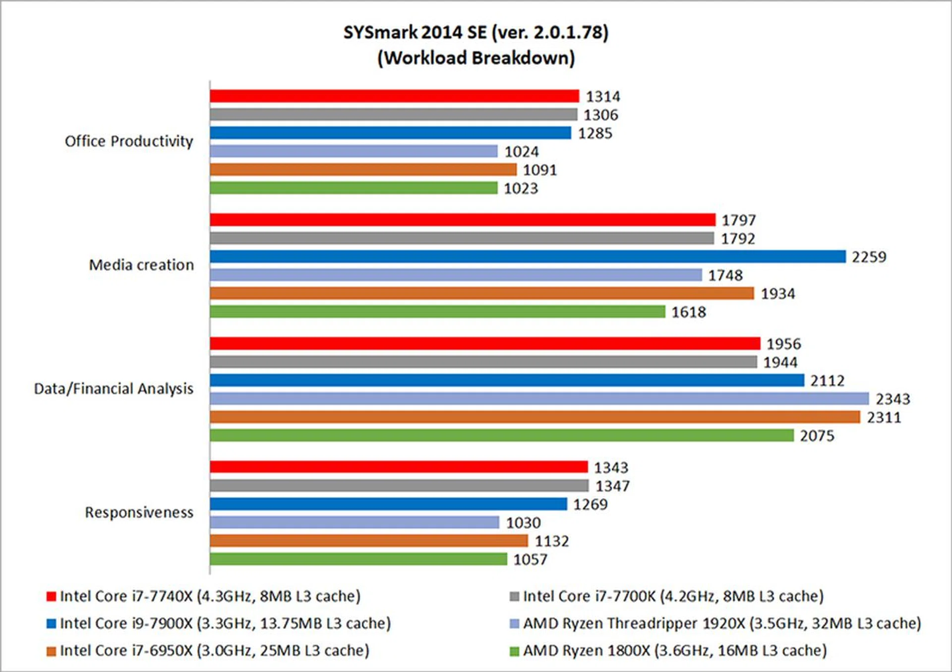 However, the high single-core clocks of the Core i7-7740X and Core i7-7700K helped them come ahead in less heavily threaded workloads like office productivity and measures of responsiveness.
