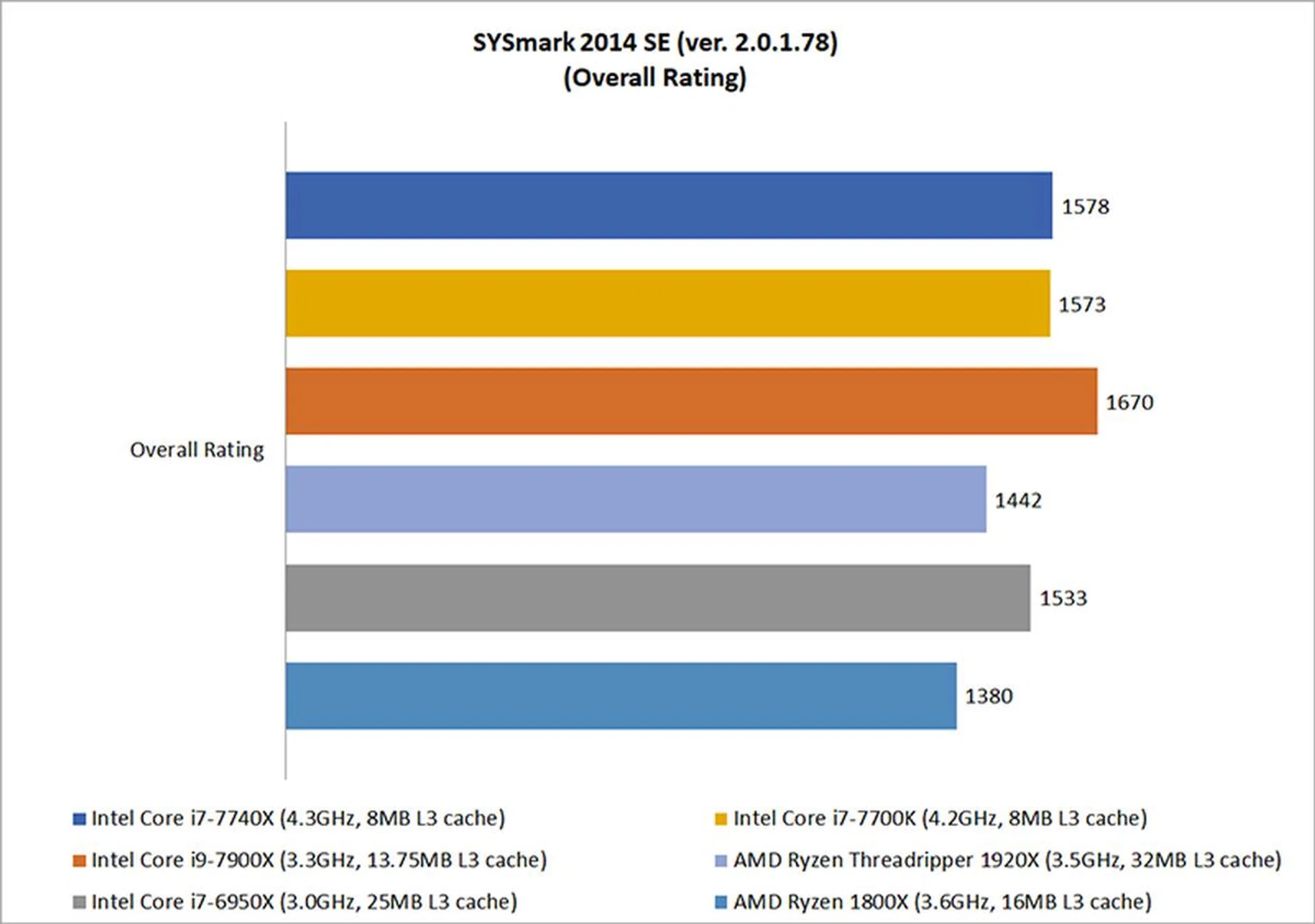The Core i7-7740X was again second to only the Core i9-7900X, but this time it beat the Core i7-7700K by nearly 7 per cent. As in SYSmark 2014 SE, the Kaby Lake-X processor had a strong performance in basic computing and productivity tasks such as web browsing, spreadsheets, and work productivity.