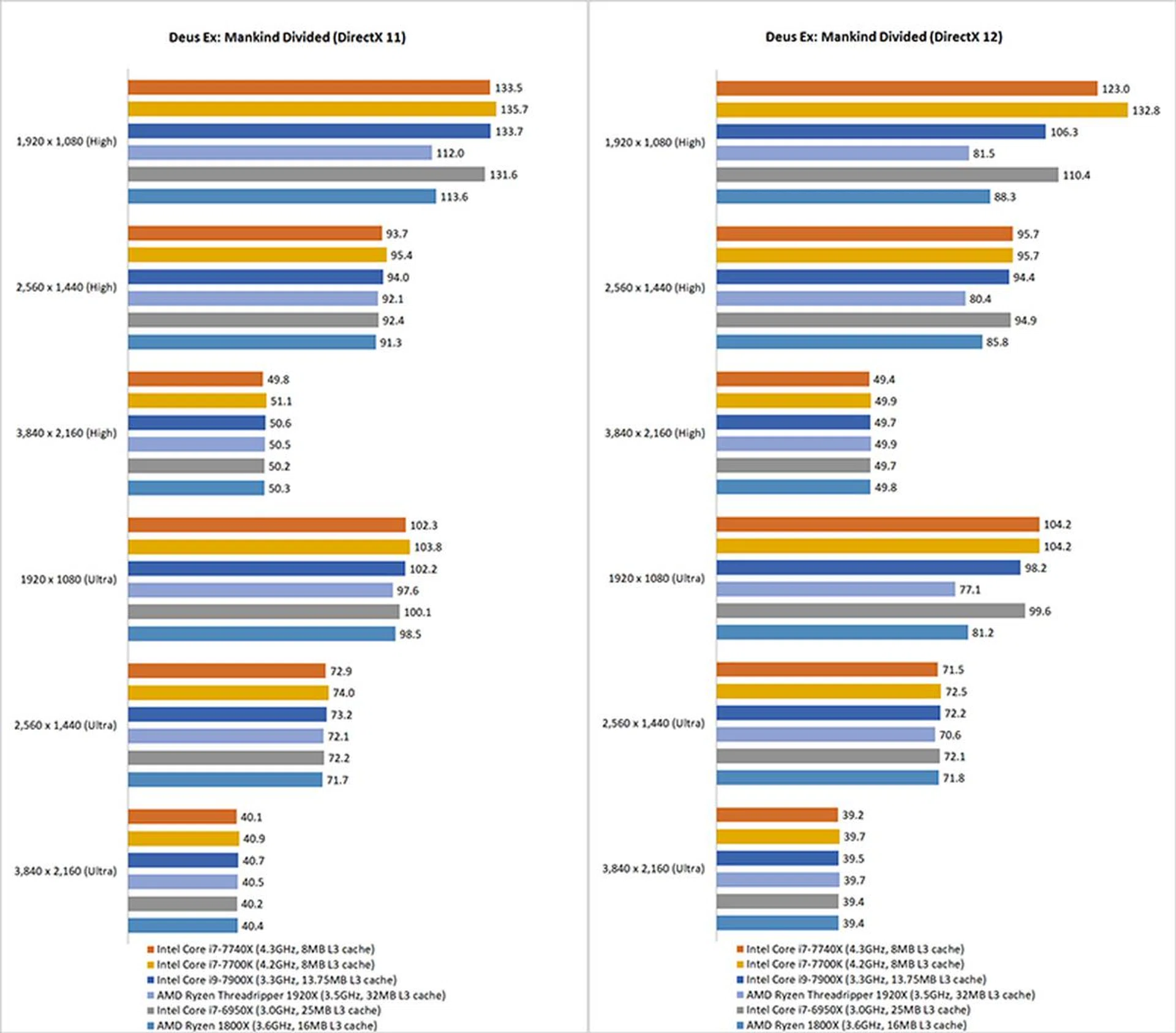 This is also a title that has reportedly been tweaked to better take advantage of multiple cores, so it’s not surprising to see the Core i9-7900X and Ryzen Threadripper 1920X edge ahead here, especially at the less demanding settings (the 1920X's lead is mostly limited to DirectX 12 mode).