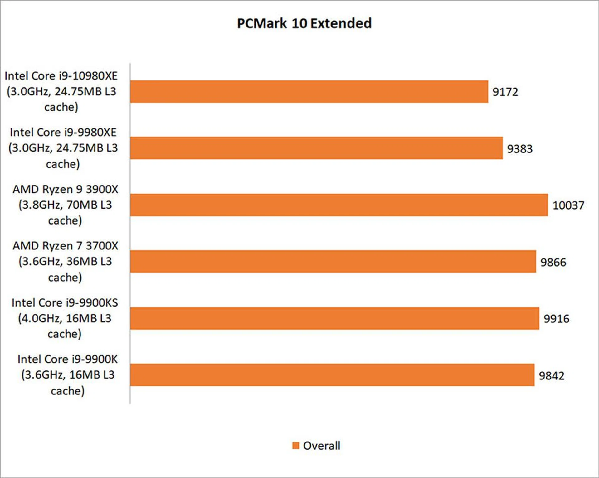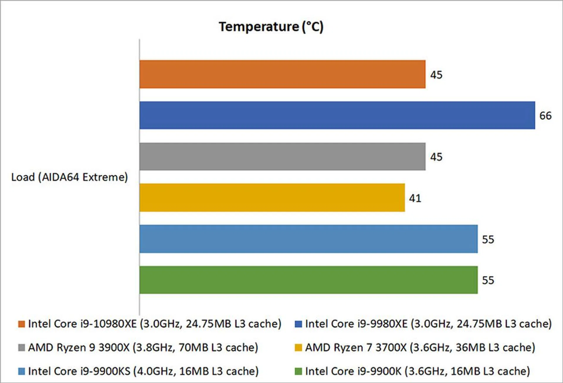 The Core i9-10980XE was roughly on par with AMD's chips here, while the lead quite clearly belongs to the Core i9-9900K and Core i9-9900KS.
