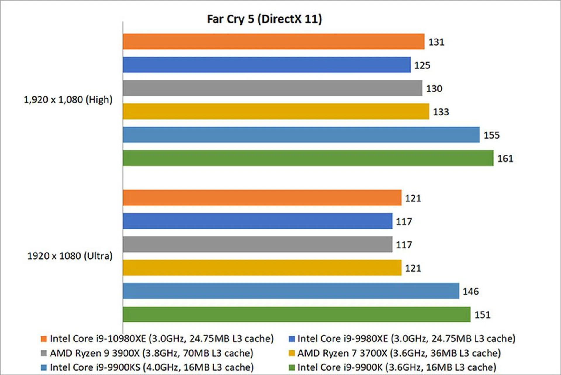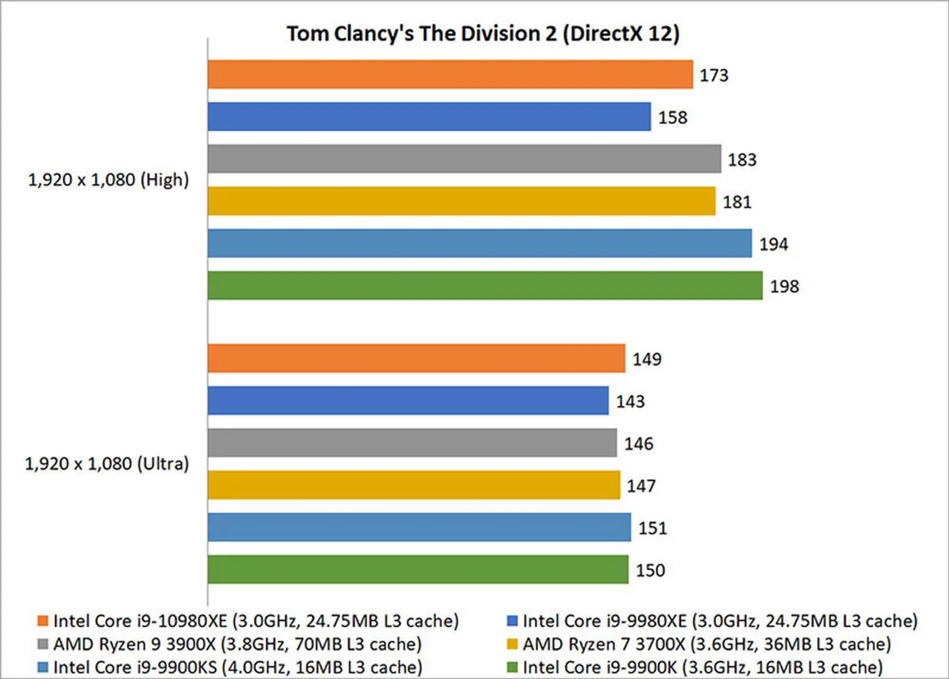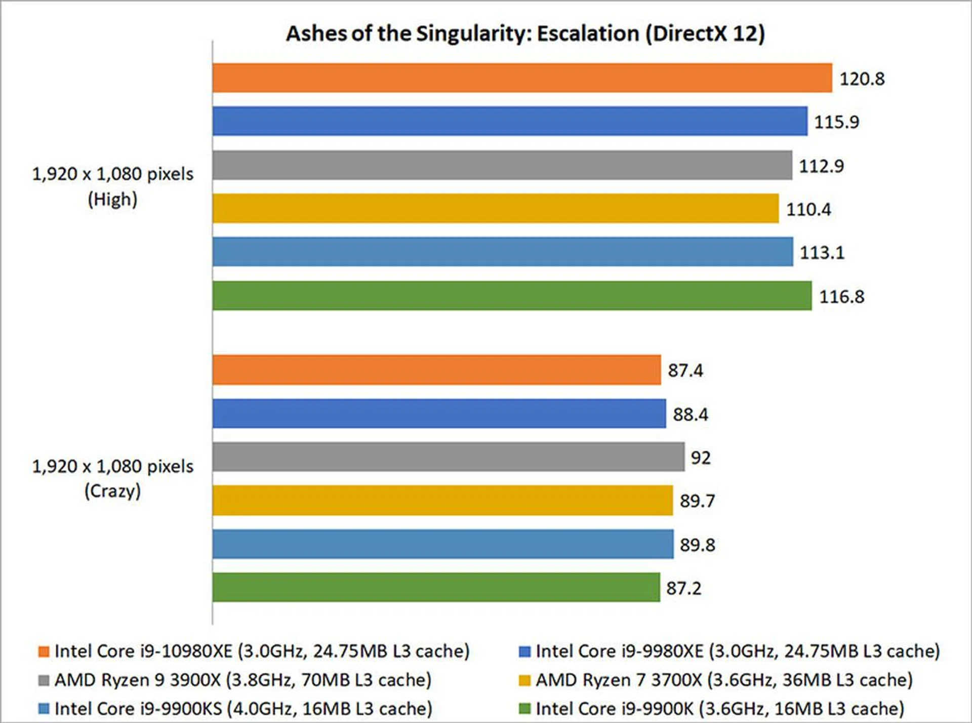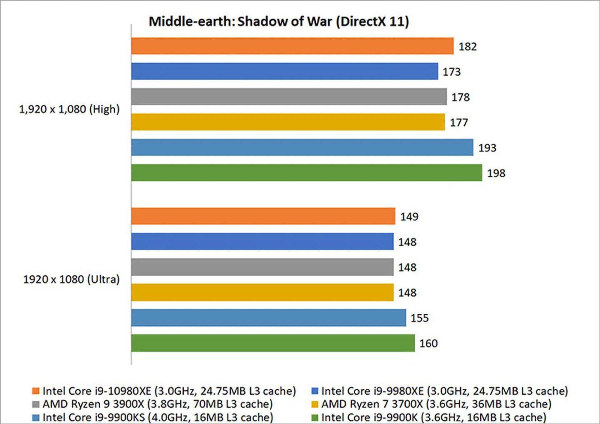 The Core i9-1098XE is slower than the Ryzen 9 3900X at High settings, but the performance numbers even out at Ultra settings, even for the Core i9-9900K and Core i9-9900KS.