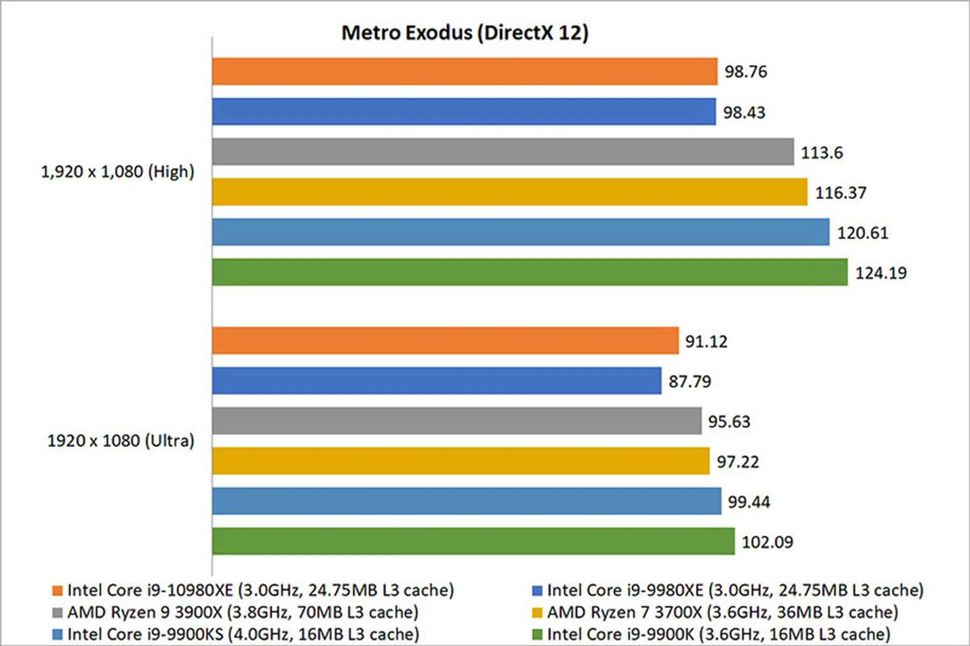 Unfortunately, the Core i9-10980XE doesn't do as well in Metro Exodus, which is a really demanding game to run. It performed roughly the same as the Core i9-9980XE, and both chips were approximately 14 per cent slower than the Ryzen 9 3900X. It's possible that the game doesn't take too well to more cores, since the Ryzen 7 3700X also did better than the Ryzen 9 3900X.