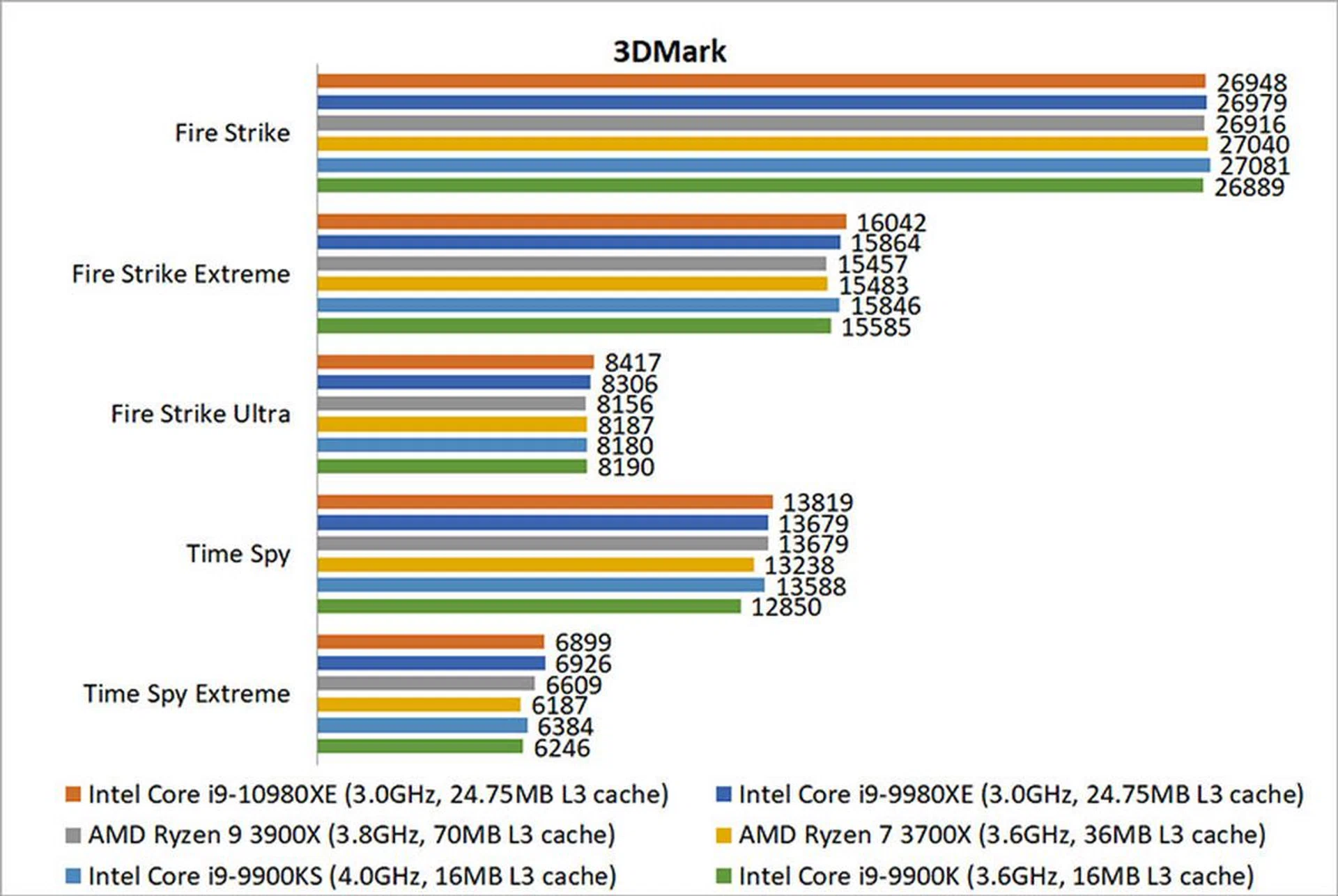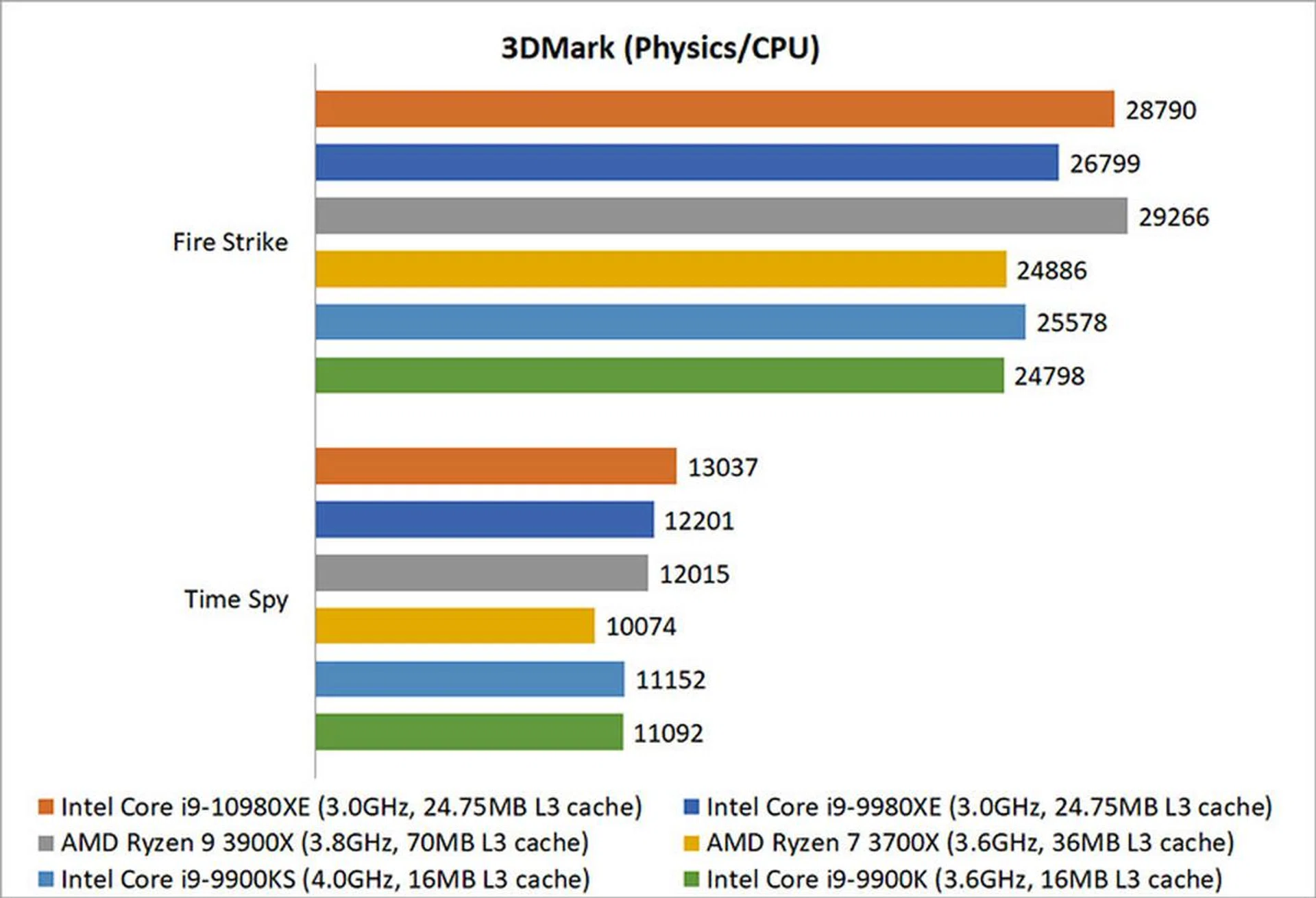 Performance is pretty similar across the board, although the Physics and CPU scores are more revealing. The Core i9-10980XE doesn't have the best showing in terms of Fire Strike Physics scores though, coming in behind the Ryzen 9 3900X. However, it manages to top the board for the Time Spy CPU numbers.