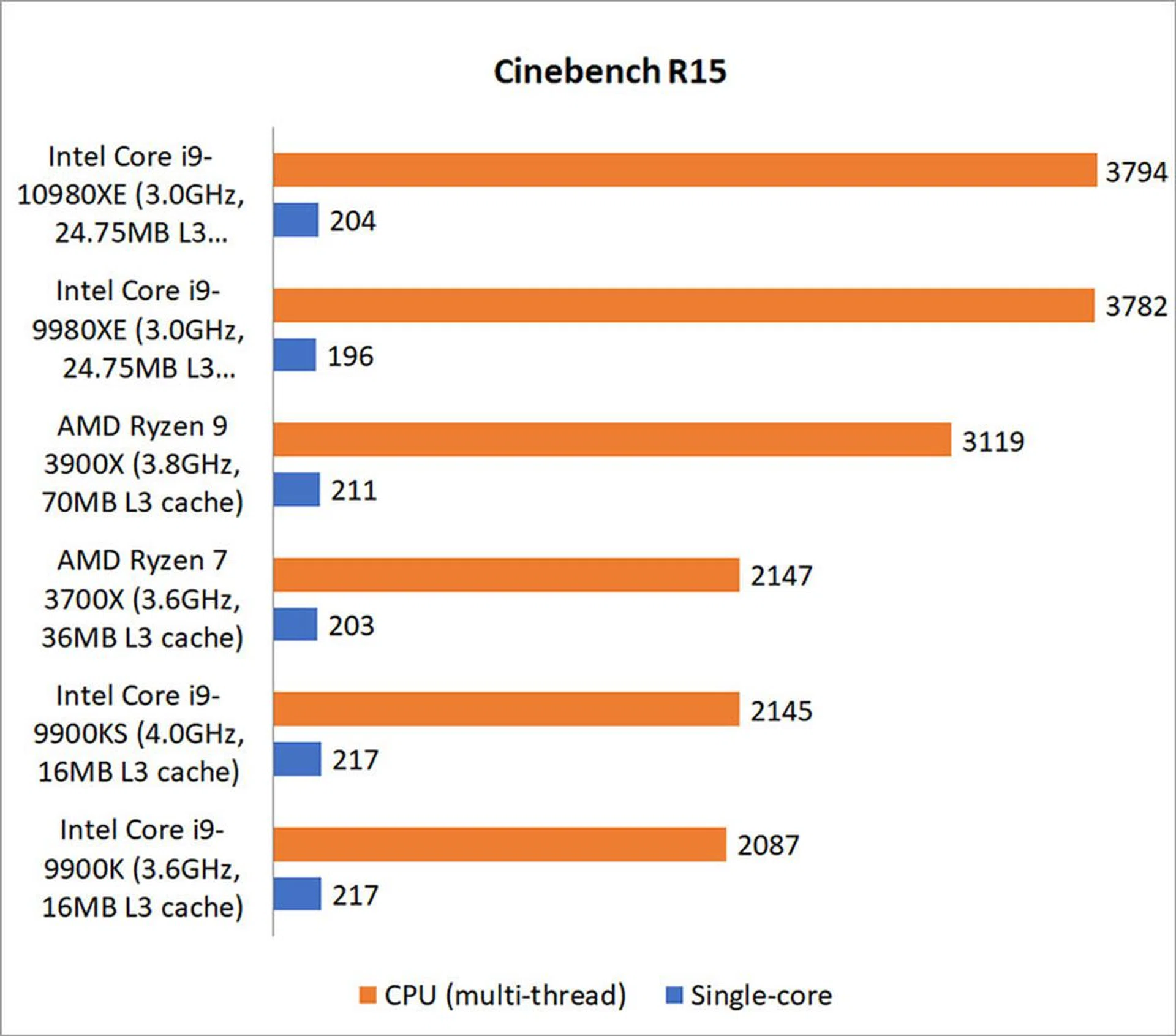 That said, the Core i9-10980XE was still the overall top performer in the multi-threaded benchmarks, owing to its 18 cores. In Cinebench R15, it was around 19 per cent faster than the Ryzen 9 3900X.
