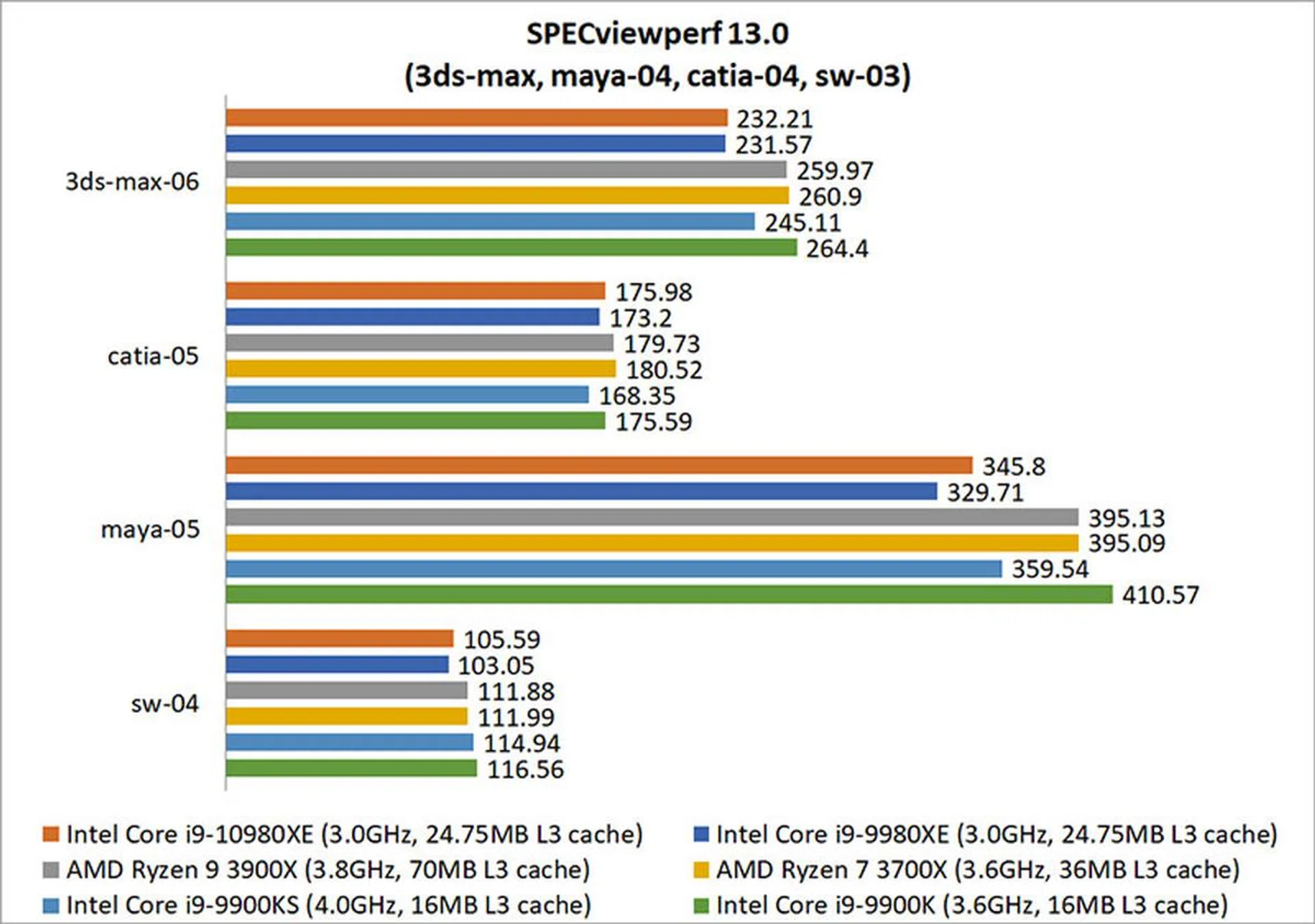 The Core i9-10980XE lags behind in SPECviewperf 13.0 as well, consistently coming in behind both AMD chips.
