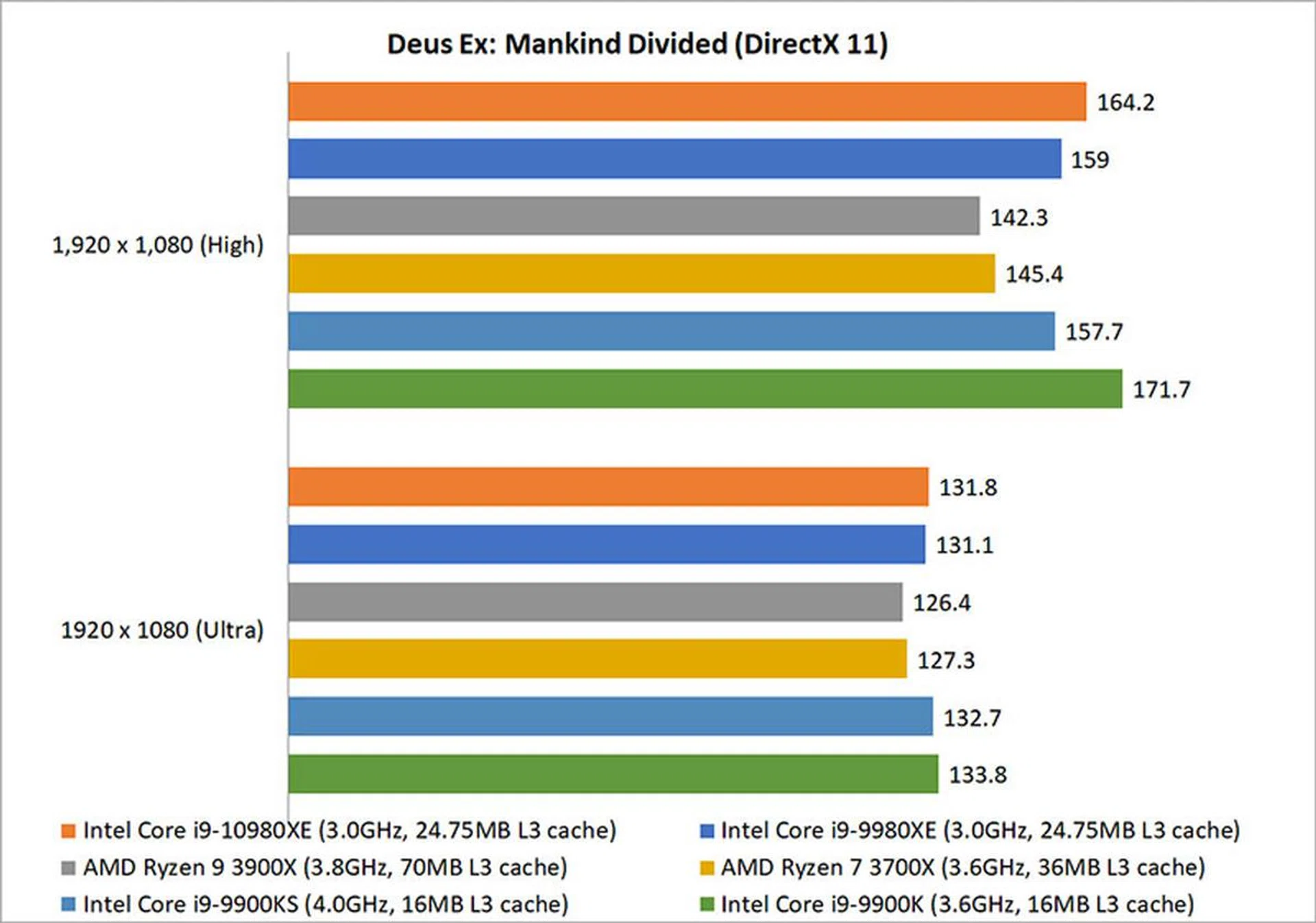 The new 18-core Intel chip does well in Mankind Divided too, beating even the Core i9-9900KS at High settings. It was also around 14 per cent quicker than the Ryzen 9 3900X at those same settings. However, the fastest chip here was the older Core i9-9900K.