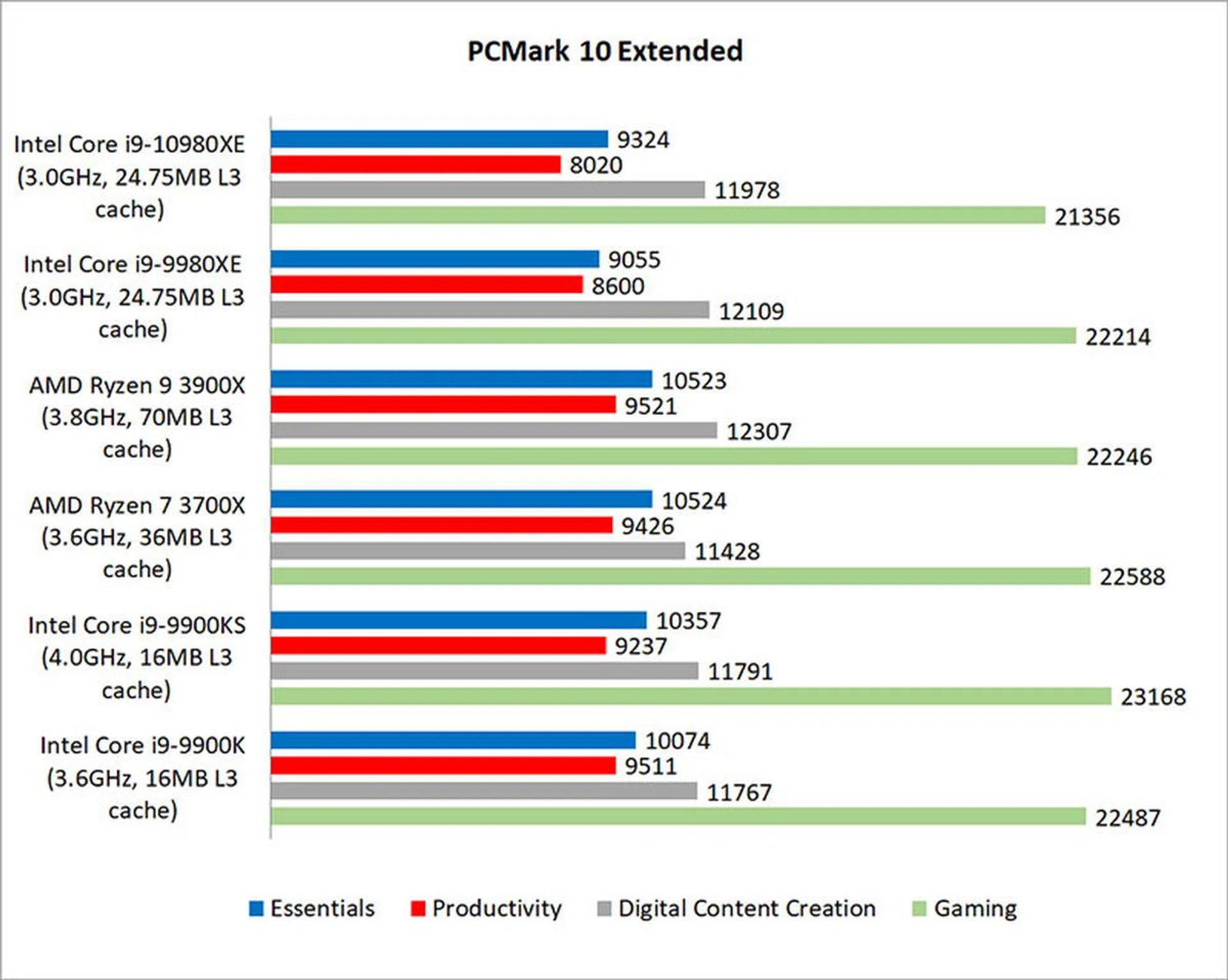 The Core i9-10980XE was slower than even the Core i9-9980XE in terms of overall scores, and a look at the score breakdown shows it lagging behind in productivity workloads. In addition, it trailed the 12-core Ryzen 9 3900X by around 9 per cent.