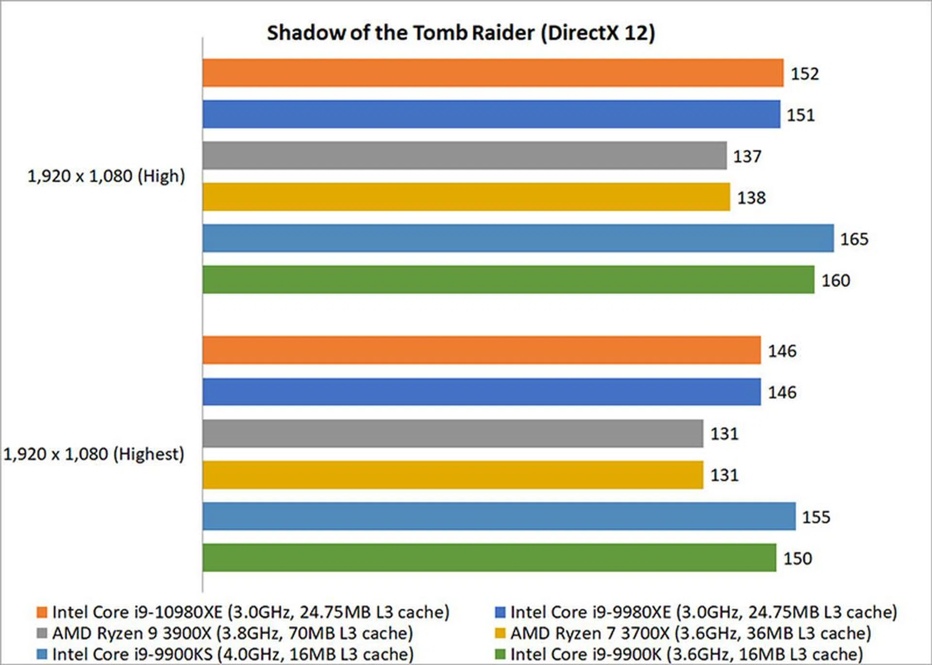 The Core i9-10980XE performs well in Shadow of the Tomb Raider too, but it manages to hang onto its lead over the Ryzen chips even at the Highest settings. In the latter scenario, it was around 10 per cent faster than the Ryzen 9 3900X.