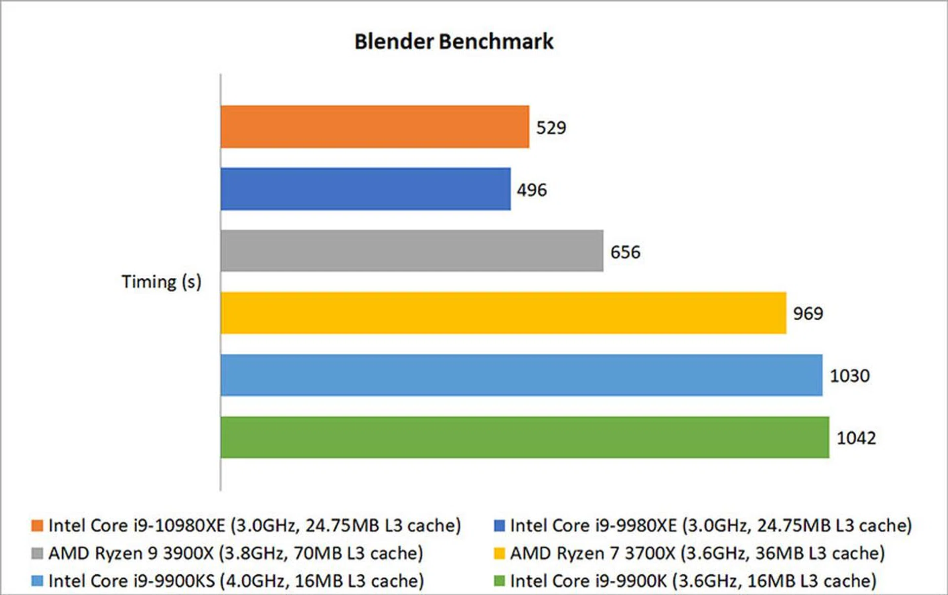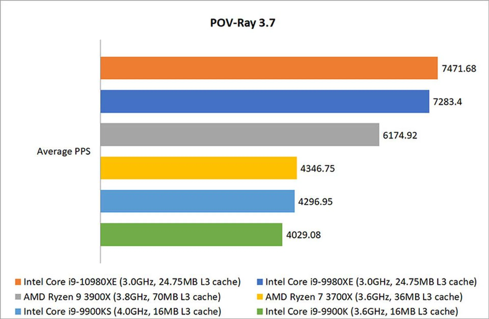 POV-Ray's built-in benchmark also favors having more cores. The Core i9-10980XE was once again the top performer here, but it was just over 2 per cent quicker than the Core i9-9980XE.