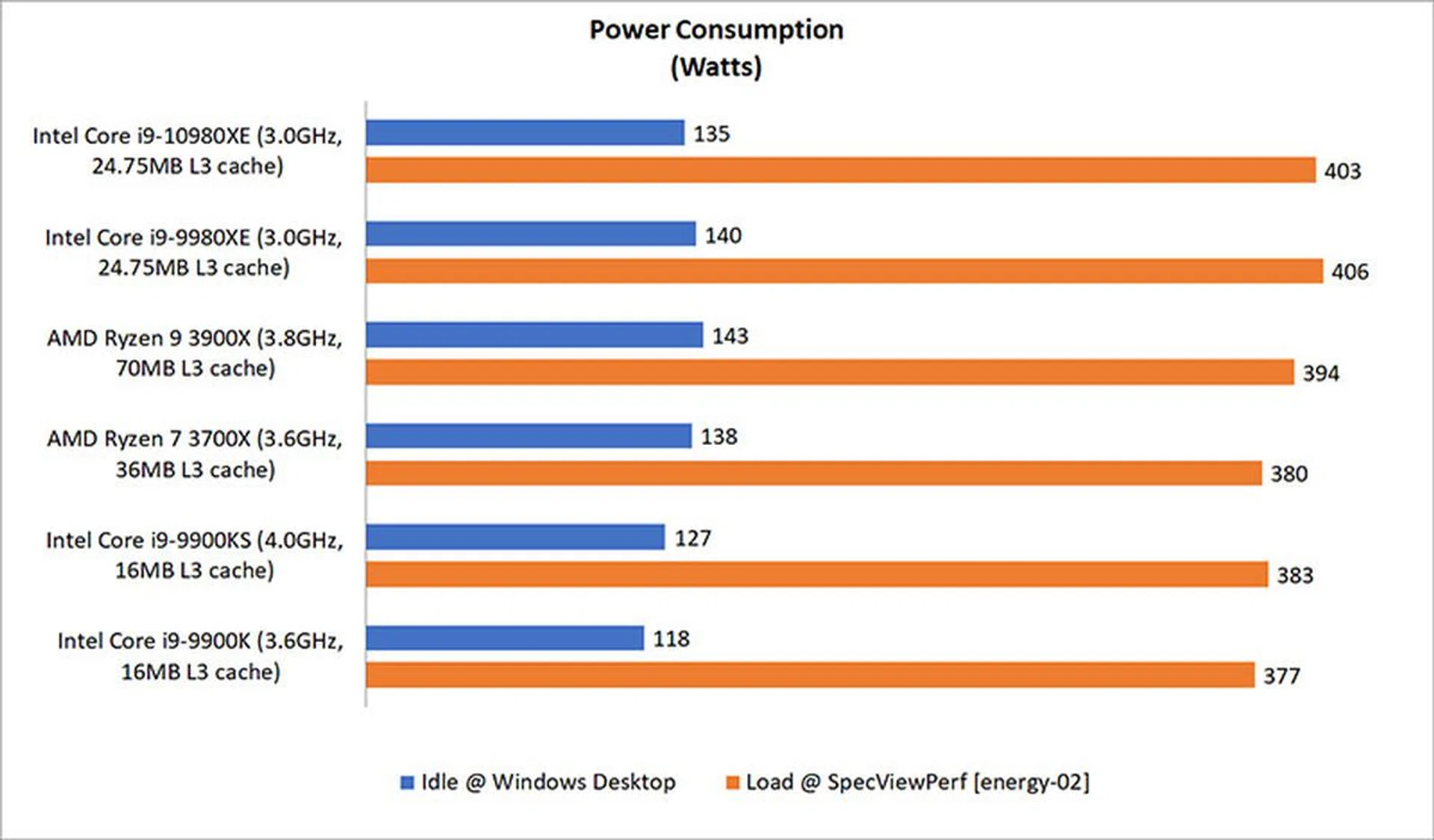The Core i9-10980XE has the same 165W TDP as the Core i9-9980XE. Power consumption numbers are largely similar, both at load and idle. Temperature performance is a different ball game though, and the Core i9-10980XE demonstrates much improved thermals compared to the Core i9-9980XE.