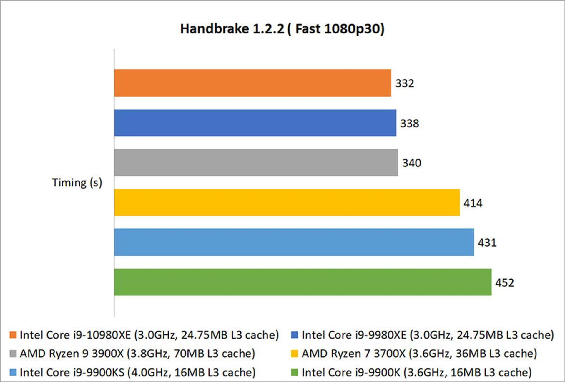 This is where the six extra cores on the Core i9-10980XE come in handy compared to the Ryzen 9 3900X. The new Intel chip was the fastest of the lot, beating its predecessor by six seconds as well.