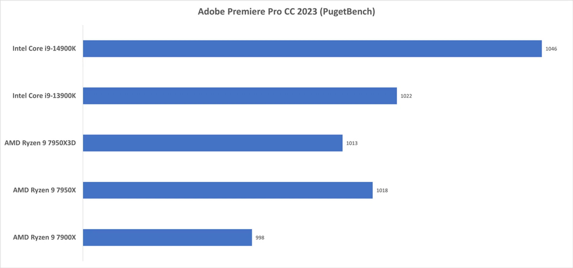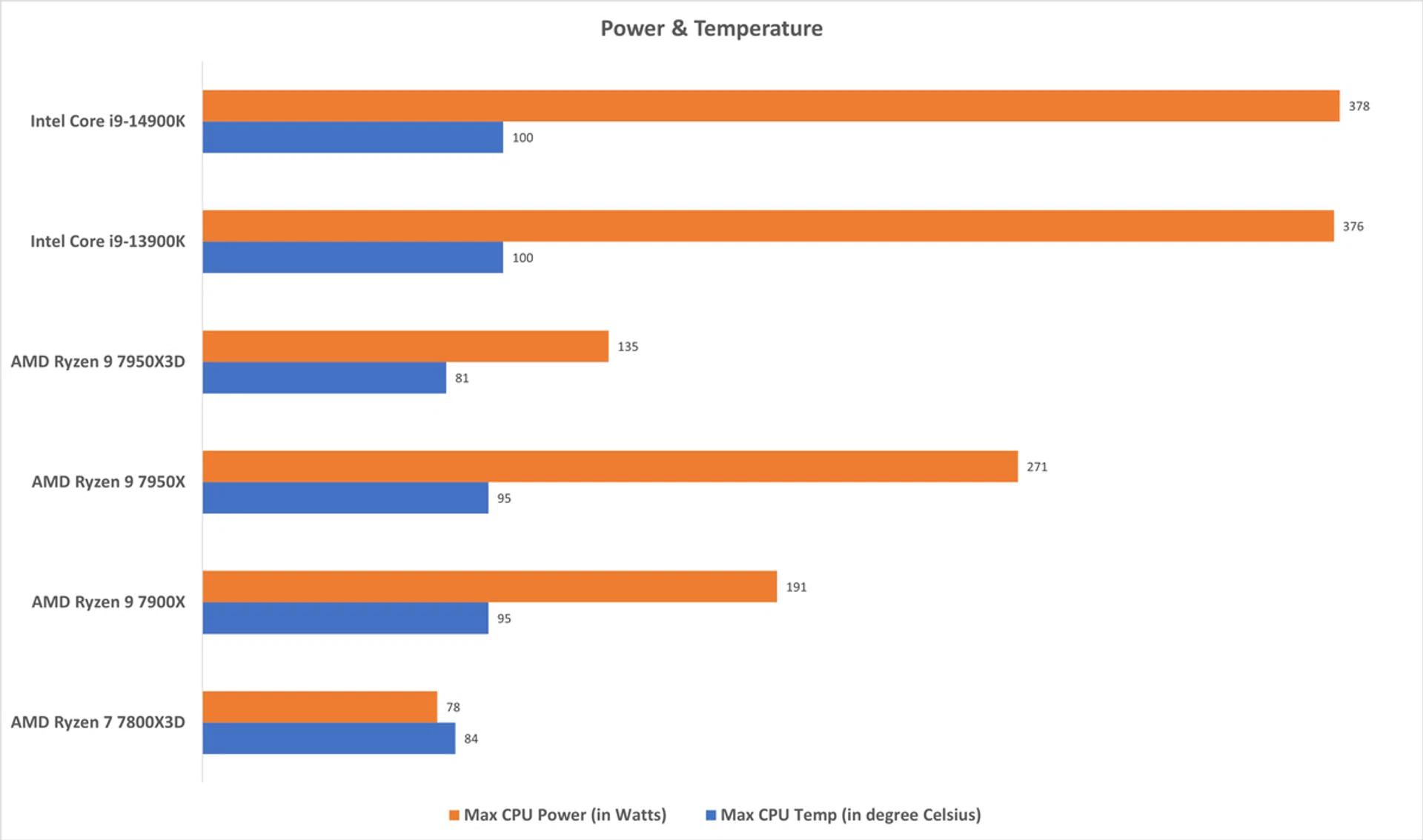 What about thermal efficiency? Well, the Core i9-14900K shows no significant improvement over its predecessor either. This was particularly evident during a PugetBench workload (with Adobe Premiere Pro), where both the 14900K and the i9-13900K peaked at 100 degrees Celsius. This contrasts sharply with AMD's offerings, with the 7950X reaching 96 degrees Celsius and the 7950X3D maxing out at a cooler 81 degrees Celsius. So, while Intel's chip slightly surpasses AMD in terms of performance in the same benchmark, it does so at the expense of greater heat generation and power consumption – in fact, more than doubling the 7950X3D, which is proving to be a beast of a processor at thermal efficiency.