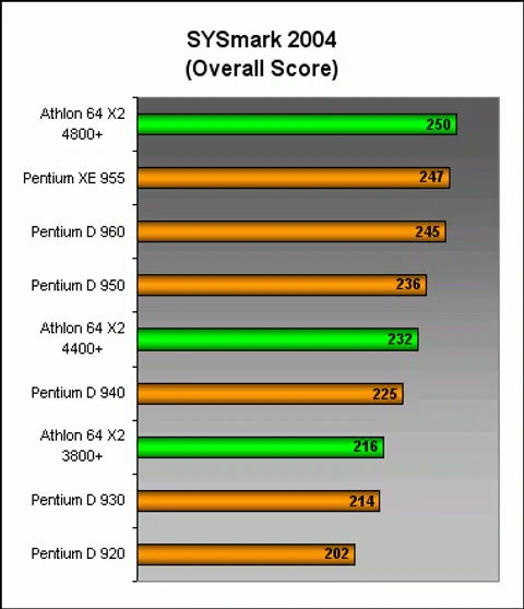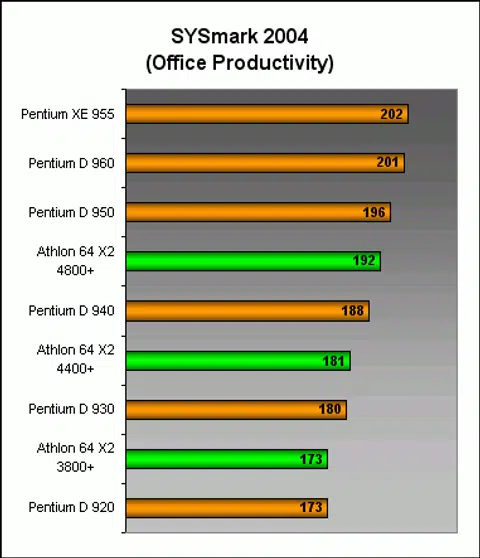For its price, the new Pentium D 960's performance matches that of the US$1,000 Pentium 955 XE model and that's quite commendable. However, it's unable to displace the Athlon 64 X2 4800+ that performed remarkably in the Content Creation test suite, thus pulling its overall performance score a good degree. Office productivity scores took a hit for the entire Athlon 64 X2 series and that's because of the large working data sets preferring the Pentium D 900 series equipped with double the L2 cache quantity. Looking at the overall scores, it's a good bet that the Athlon 64 X2 4600+ would be equally matched up with the new Pentium D 960 rather than the 4800+ model in both performance and price.
