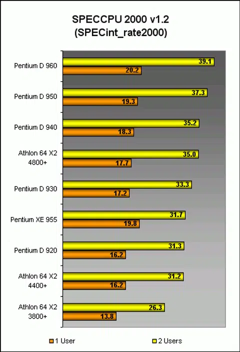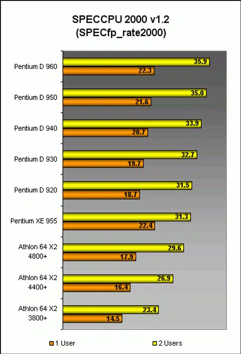 AMD's position hardly changed in the SPEC rate tests, but surprisingly, the Intel Pentium 955 XE sort of 'fumbled' when two copies of the same workload were executed. The reason? Hyper-Threading is the culprit here. If you recall, the Extreme Edition class of processors have Hyper-Threading to allow them to execute four threads consecutively (on four logical processors, but there are only two real physical cores). The Pentium D class processors on the other hand, have no Hyper-Threading, limiting them to two threads for simultaneous execution on the two real physical cores. Now what happens on the Extreme Edition processor is that that operating system is unable to cleverly dispatch the threads to the right logical core. For example in the case of the two-user SPEC rate tests, if two threads are being issued to two logical cores that belong to the same core, the processor's equivalent operating speed is as good as back to a single core Pentium 4 with Hyper-Threading. This is the reason why the Pentium 955 XE took a substantial performance hit. There are actually more such scenarios in our benchmark suite and this only goes to show that Hyper-Threading isn't really your best ally in all cases though it was a great idea to use unused processor resources. The current generation of processors is probably the last of them to feature Hyper-Threading as Intel's forthcoming Core 2 Duo processors will no longer have it and looking even further ahead, Intel is going to employ multiple cores instead.