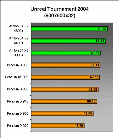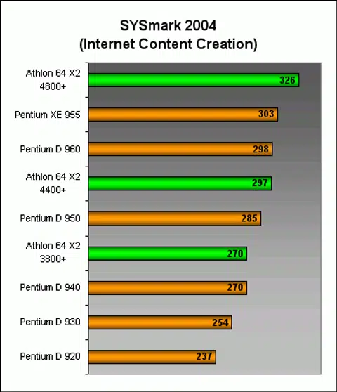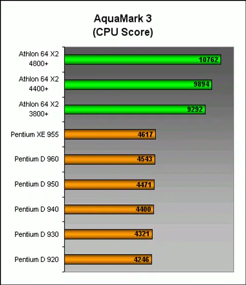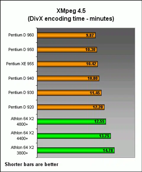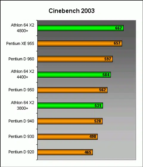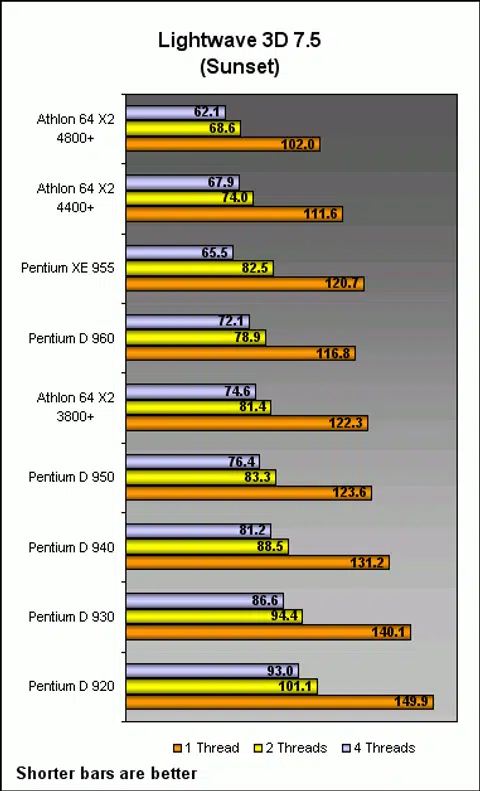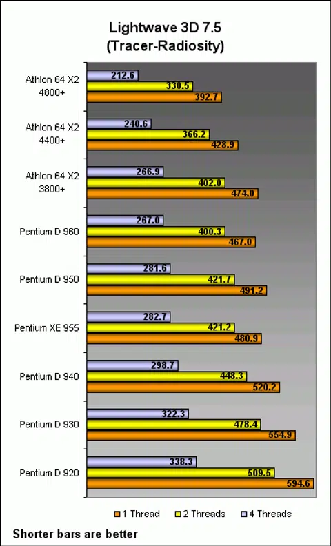 The Athlon 64 X2 lineup takes a huge win in this rendering benchmark that has benefited tremendously from its efficient architecture's short pipelines and well tweaked memory controller. Even the Athlon 64 X2 3800+ performs almost as well as the Pentium D 960.