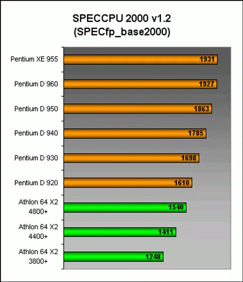 In the grueling compute intensive SPECCPU tests, the Pentium D 960 came out tops in this comparison, rivaling and even surpassing the once supreme Pentium 955 XE processor. Clearly, the raw clock speed advantage of the 3.6GHz Pentium D 960 was easily favored over all other factors, evident from the results and true to the nature of the benchmark. No thanks to this newcomer, it looks like the Pentium 955 XE is destined to gather dust on the shelves. Its AMD competitors too had a hard time keeping up in this test and were greatly disadvantaged by their low clock speeds and were distanced further in the floating-point tests as the Intel processors have always had an upper hand in this area due to their NetBurst architecture.