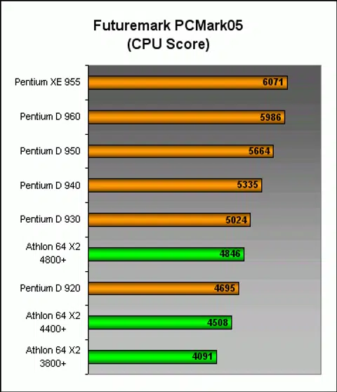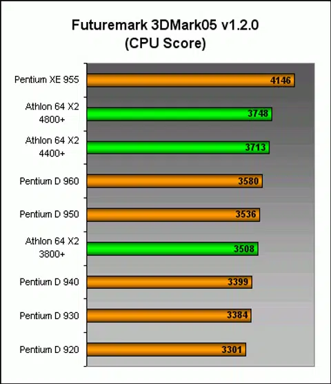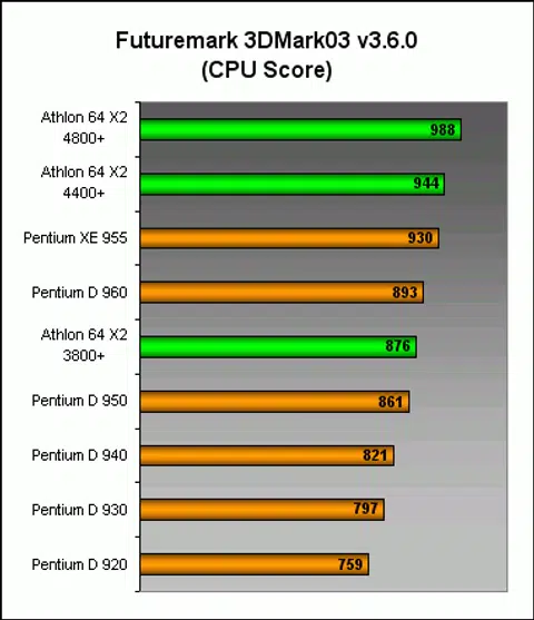 Similar to the Lightwave 3D application, Cinebench 2003 is another rendering benchmark where AMD's shorter processing pipelines gave it an upper hand in this test. As for the Pentium D 960, it was trailing some 10% behind the Extreme Edition processor mainly because it was disadvantaged by its limited 800MHz FSB versus the latter 1066MHz FSB. The test most definitely scales with processor clock speeds, but it also factors in overall system throughput and as such, the Pentium 955 Extreme Edition took the lead here.