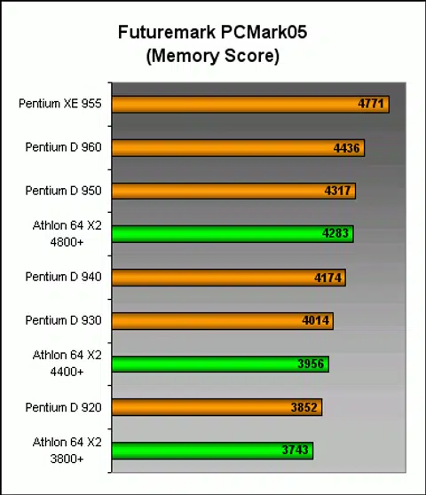 Next, we have a few lighter tests from the PCMark05 test suite to quickly assess the CPU's overall performance and the platform's memory subsystem. Take note that PCMark05 taxes the CPU's cache a lot more than PCMark04, thus we see that the Intel Pentium D series excel at this test with the Pentium D 960 right on the heels of the Extreme Edition processor.