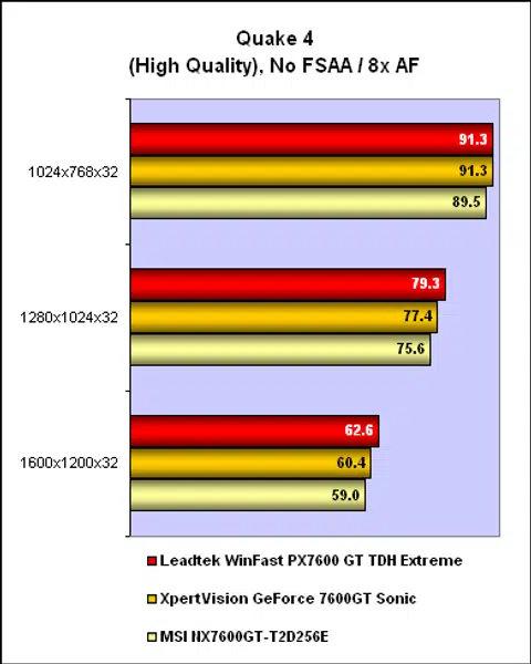 A couple of frames were again the rough differences between the two overclocked cards in Quake 4, with the Leadtek Extreme naturally the fastest among the three. As all the cards were more than capable of handling this OpenGL game, getting the Leadtek will allow one the satisfaction of getting that extra frame or two when running Quake 4 with its full set of graphical effects enabled.