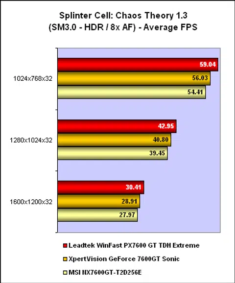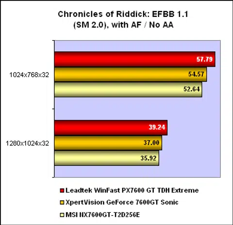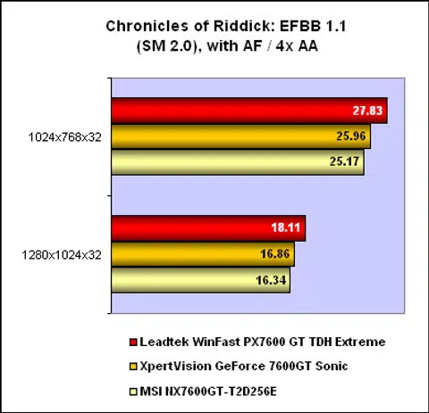 The Leadtek Extreme took the spotlight again in Chronicles of Riddick, leading the trio of cards easily. On average, it was about two to three frames faster than the overclocked XpertVision so there's probably no doubt that the Leadtek would still make a difference to gamers who already have a GeForce 7600 GT.