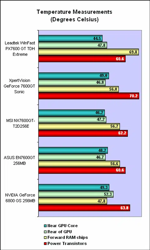 The core of the Leadtek Extreme was well cooled by its large and capable cooler as shown by its comparatively low temperature of 44.5 degrees even at its default overclocked speed. It was too bad that this positive aspect came with a price, namely the memory chips were much warmer than the other GeForce 7600 GT cards that we tested. These chips were under the shade of the cooler but as there was no direct contact, it didn't help as much as hinder it by trapping heat around the memory chips. Hence, we noticed the much higher temperatures for the memory chips. Thankfully though, that didn't hamper the overclocking spirit of the card as we've found out – more about that on the following page.
