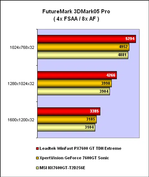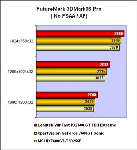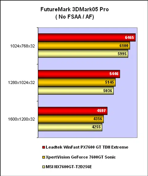 Our most recent GeForce 7600 GT review was the excellent XpertVision GeForce 7600GT Sonic, overclocked to an impressive 575/1500MHz. The Leadtek Extreme however, tops that with its default 590/1600MHz, so hopefully the benchmarks will show how significant the differences are between them. Finally, MSI's reference clocked card is thrown into the fray to highlight the typical performance level of a vanilla GeForce 7600 GT. All three cards were using ForceWare 84.21 drivers and we tested the following benchmarks:
