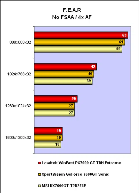 The results of the three cards split themselves into three distinct performance levels in the two DirectX 9 games - the third installment of Splinter Cell and F.E.A.R. The 5% increase in frame rates in Splinter Cell over the XpertVision meant a couple of extra frames, useful in a pinch, especially at the higher resolutions like 1600 x 1200, where the Leadtek managed to hit the requisite 30 frames per second for smooth gaming. In F.E.A.R, the higher clock speeds of the Leadtek saw slightly higher frames rates too, though this extremely demanding game brings all the cards to their knees at a resolution of 1280 x 1024 and even the fastest GeForce 7600 GT will struggle.