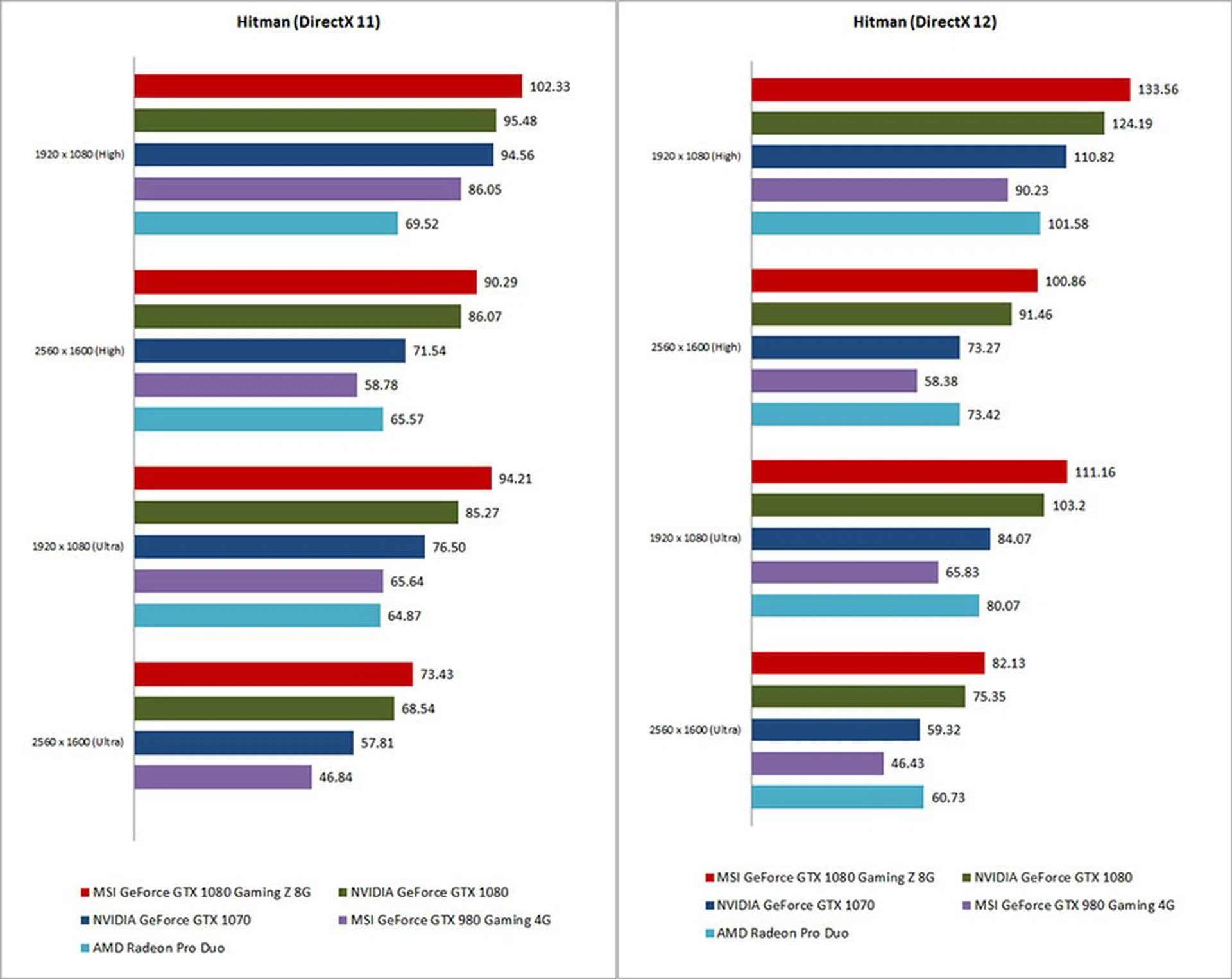 The performance difference was more pronounced in Hitman, where the Gaming Z card leapt ahead of the Founders Edition model by as much as 8 percent in certain cases.