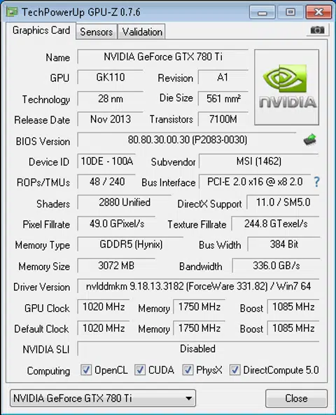 - MSI GeForce GTX 780Ti Gaming 3G 3GB GDDR5 (ForceWare 331.82)