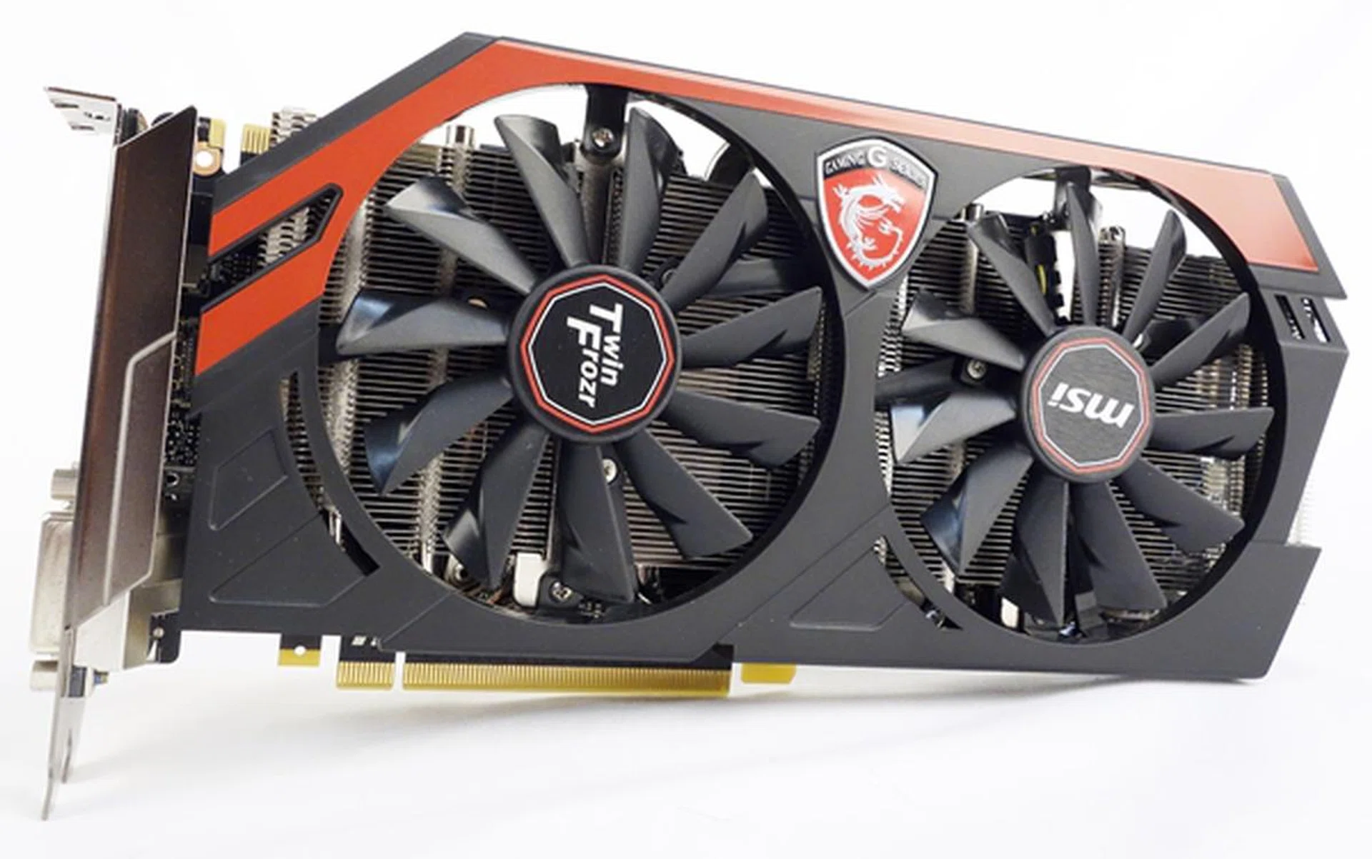 The card sports the familiar red-and-black color scheme of MSI's Gaming series. For its cooling system, it sports the familiar Twin IV Frozr that features dual 100mm fans, and five copper heatpipes in direct contact with the GPU. Heat from the GPU is transferred by the heatpipes to the large aluminum fin grid array, and it is cooled by the pair of fans. In addition, there is a metal plate attached to the PCB's components such as its Hynix memory modules and VRM components for added passive cooling. Despite this, the card still sports a dual-slot profile, and is about 10.5-inch (266mm) in length, with a height of slightly above 5 inches (129mm).