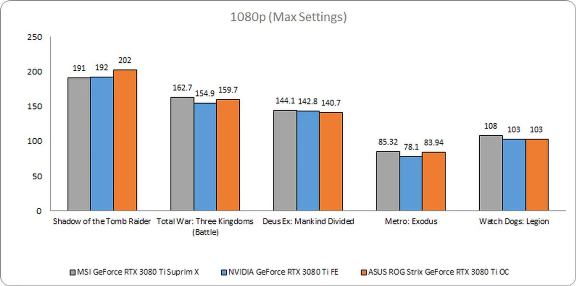 The MSI GeForce RTX 3080 Ti Suprim X cuts through all the games we tested at 1080p like a hot knife through butter. As in 3DMark, the performance difference between it and the other two cards is negligible at best.