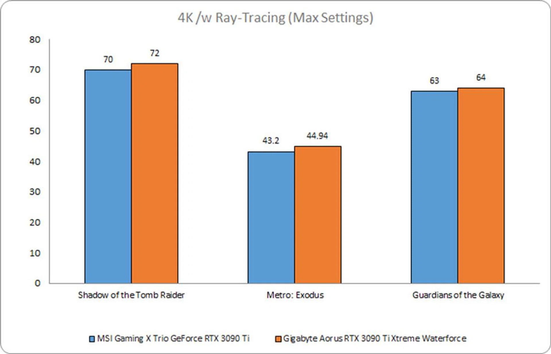As expected, ray tracing comes with a massive performance hit. Nevertheless, both cards remained neck-and-neck, although the Gigabyte unit continued to maintain its sliver of an advantage.
