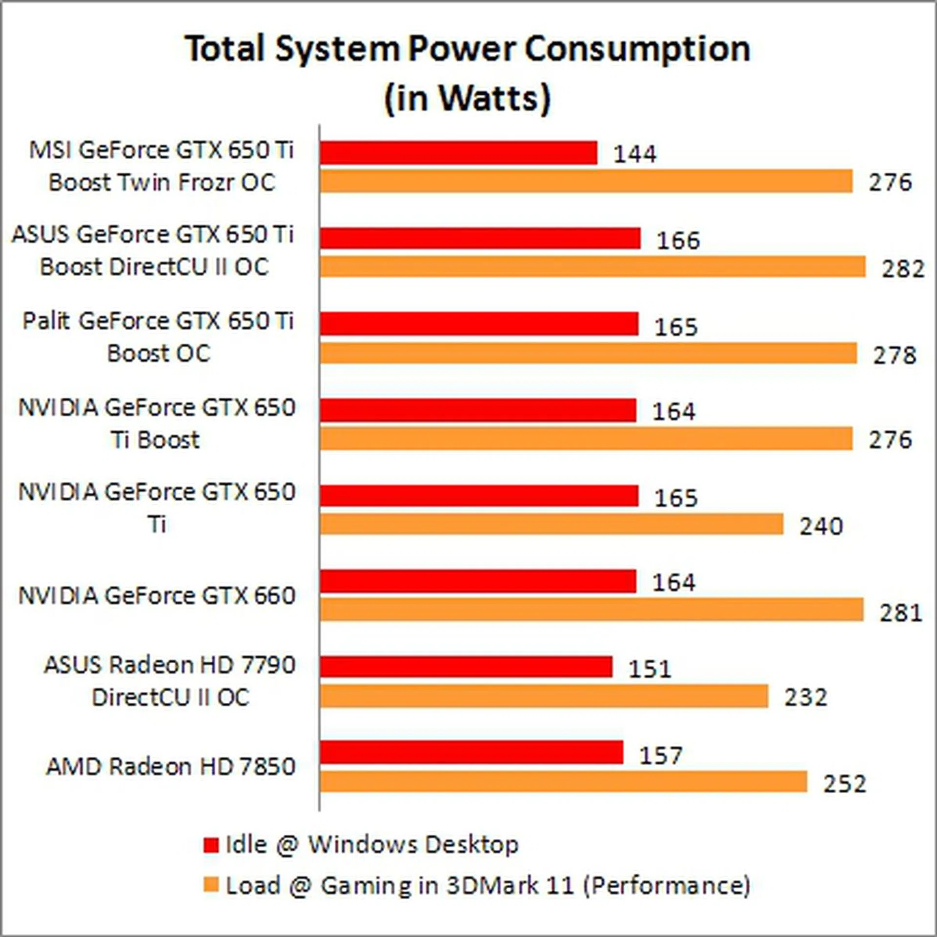 The MSI card had the lowest idle power consumption level and while during operation, its power consumption level was similar to our reference NVIDIA GeForce GTX 650 Ti Boost card.