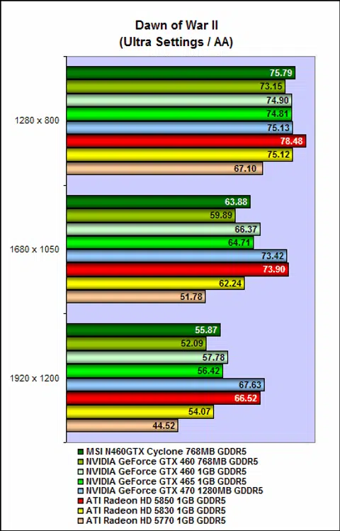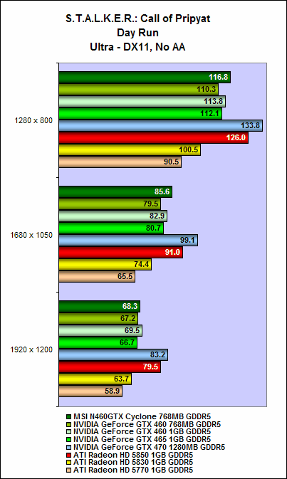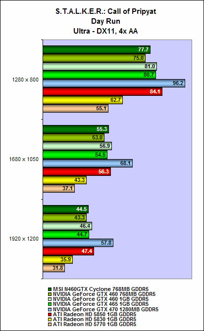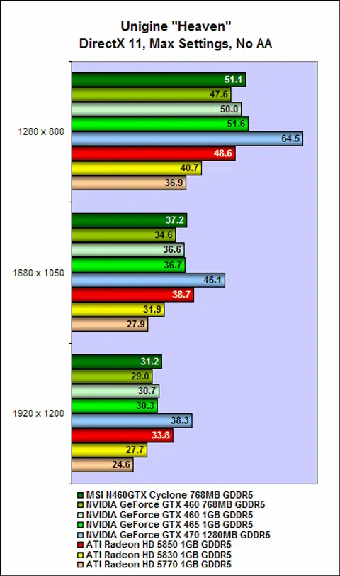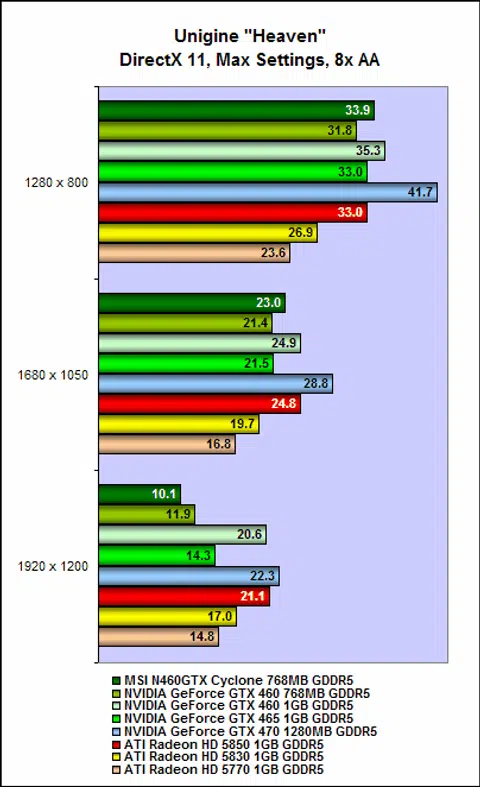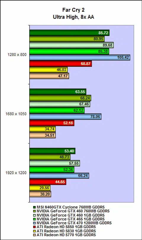 With its higher clock speeds, the MSI N460GTX Cyclone maintained its dominance over the reference 768MB card from NVIDIA. But even its higher clock speeds was not enough to outperform the reference 1GB card. Against the cards from ATI, we found the MSI card to be a good match for the pricier Radeon HD 5830.