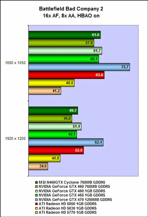 On Bad Company 2, the MSI N460GTX Cyclone persisted in posting results that were about 6% quicker than a reference 768MB card. And once more, it came close to usurping the 1GB reference card, but its smaller frame buffer size and lower memory bandwidth was limiting its performance.