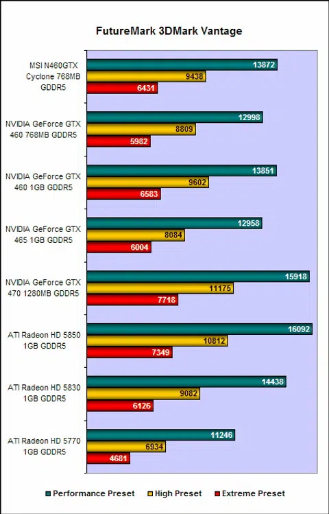 The MSI N460GTX Cyclone began brightly on 3DMark Vantage, comfortably outscoring the reference 768MB card and came close to outperforming the 1GB variant. To elaborate, the MSI card managed to outscore the 1GB reference GeForce GTX 460 on the Performance preset, but lost out on both the High and Extreme presets. Clearly, the higher clock speeds are not enough to make up for the card’s smaller framebuffer and narrower memory bus width.