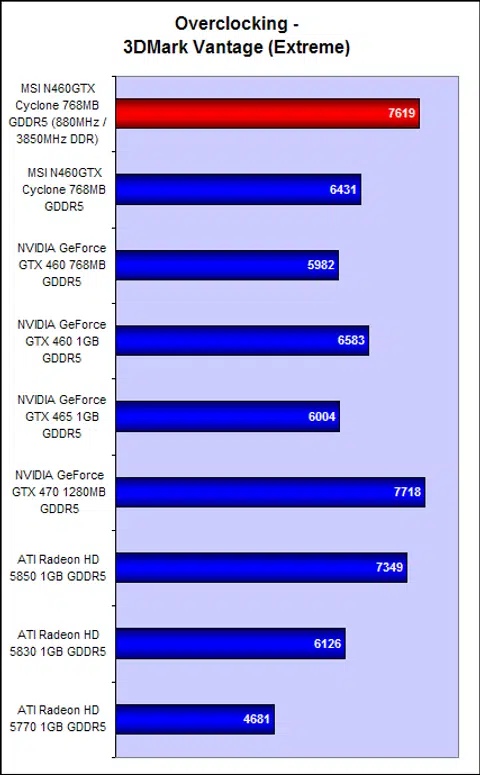 The GeForce GTX 460 is an able overclocker and the MSI N460GTX Cyclone, with its military class components, custom cooler and support for the MSI Afterburner overclocking utility, didn’t disappoint, managing to achieve a maximum overclocking state of 880MHz at the core and 3850MHz DDR at the memory. As a result, it scored 7619 3DMarks on the Extreme preset of Vantage, eclipsing even the Radeon HD 5850.