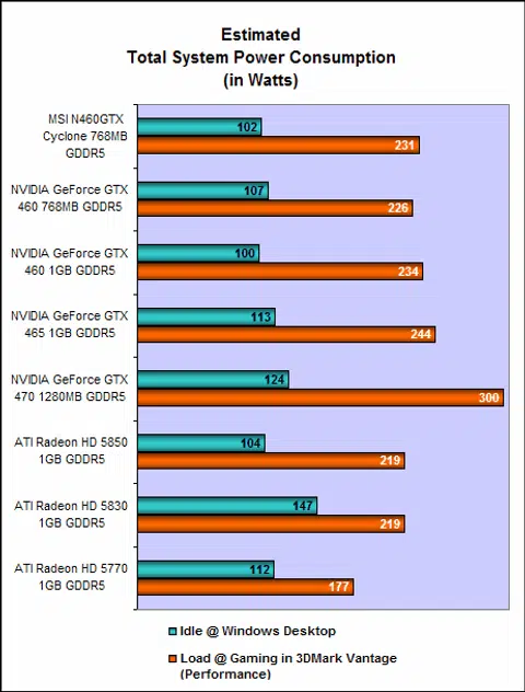 Power draw figures of the MSI N460GTX Cyclone are in line with those of NVIDIA’s reference card. Note how much the GeForce GTX 460 improves upon the earlier GTX 470 and GTX 465.